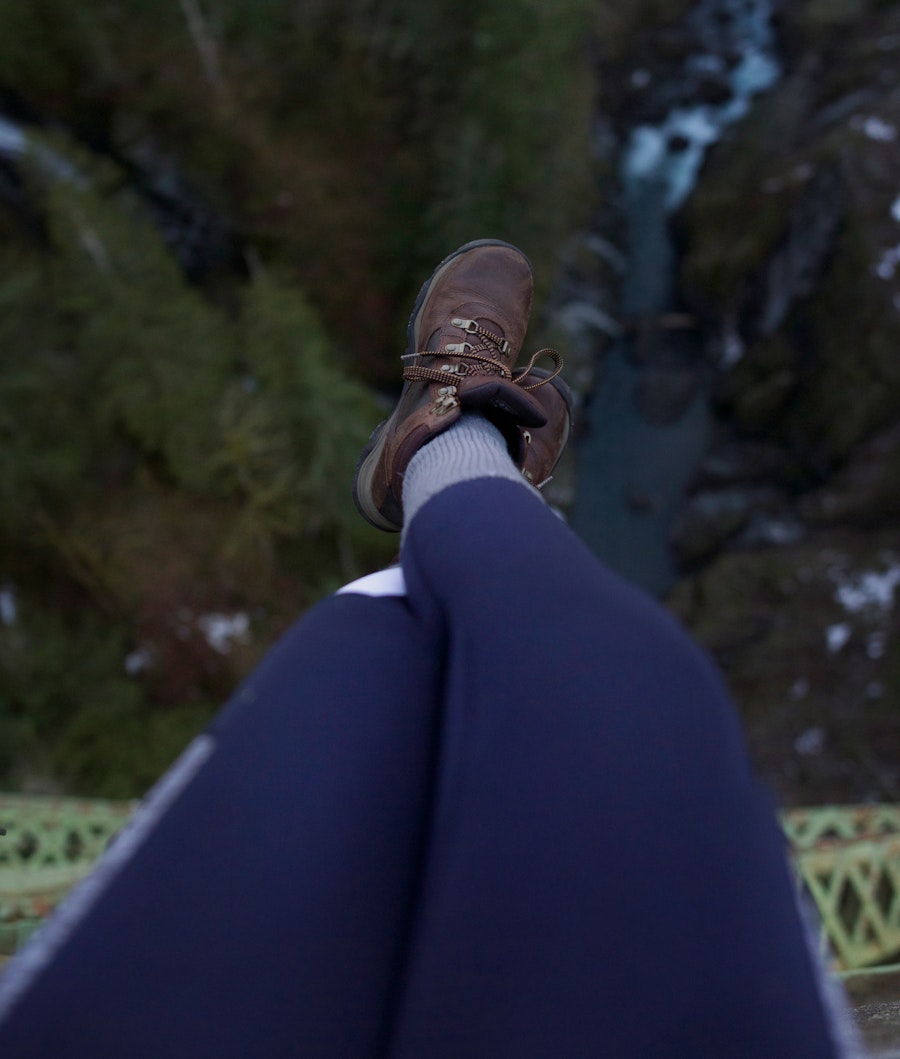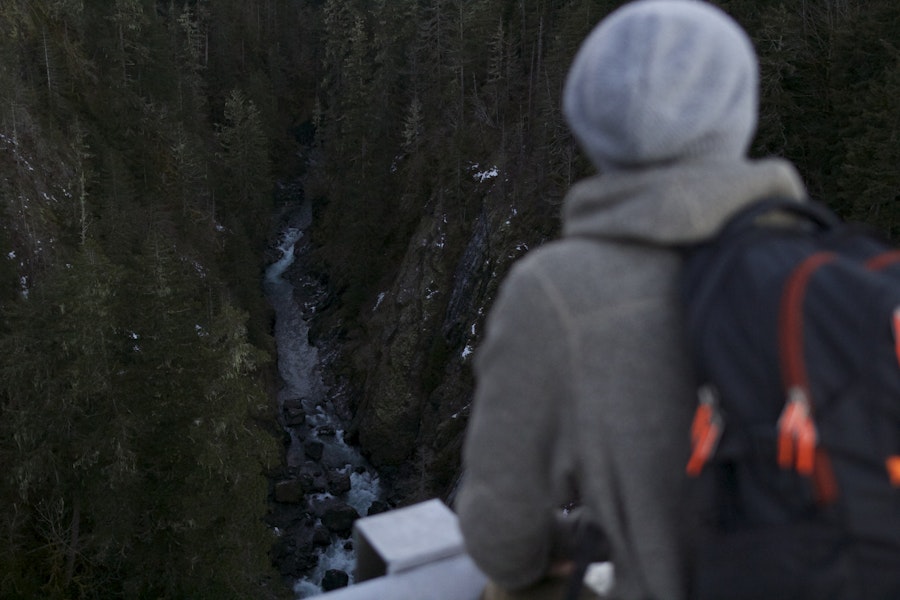 Instantly, a rare flash of vertigo strikes us, as we peer through the dim to see the creek crashing through the gorge dozens of feet below us. The feeling ebbs as the sky lightens and we explore the area with due caution.