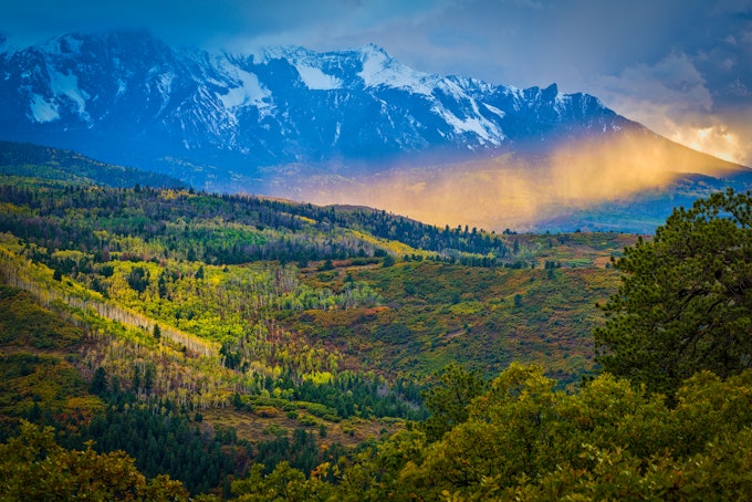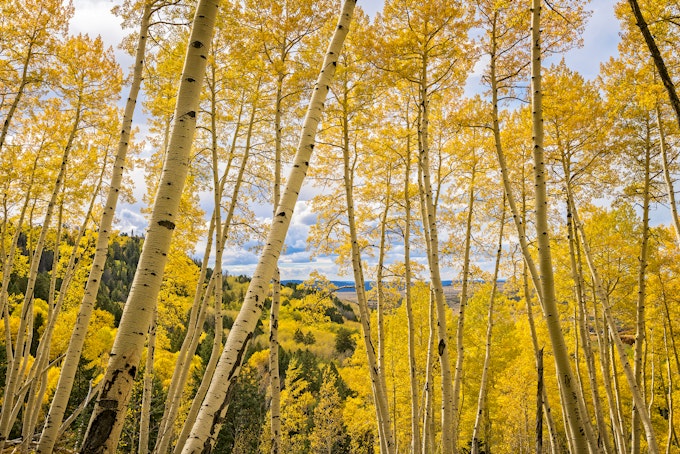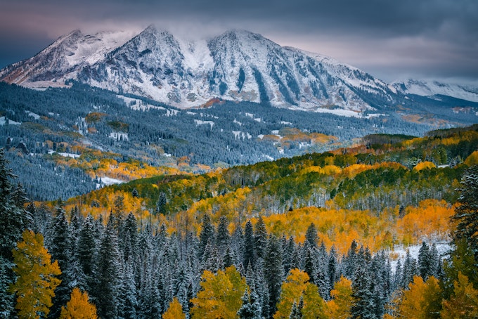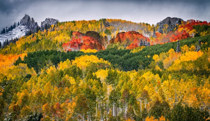 Thanks to Colorado's elevation and highly dynamic mountain weather, seasons can collide with snow blanketing the deep yellow Aspen leaves. Black and white tree trunks lining steep snowy mountainsides can add even more depth to gorgeous scenes.
