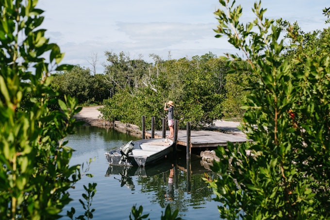 This spot isn’t well marked from the road but the lack of obvious signage is, in my eyes, a bonus. It means you have to know it’s there in order to find it. (When we visited, we were the only other people on-site. And it's only about 1.5 miles from the Islamorada Beer Company.) Once you find your way into the preserve (by the way, it’s free!), continue straight ahead towards the green tunnel of trees where you will pass a couple of picnic tables and eventually dead end near a small boat launch where you can put your kayak or SUP in. Beware however, as posted signs indicated the presence of a croc.