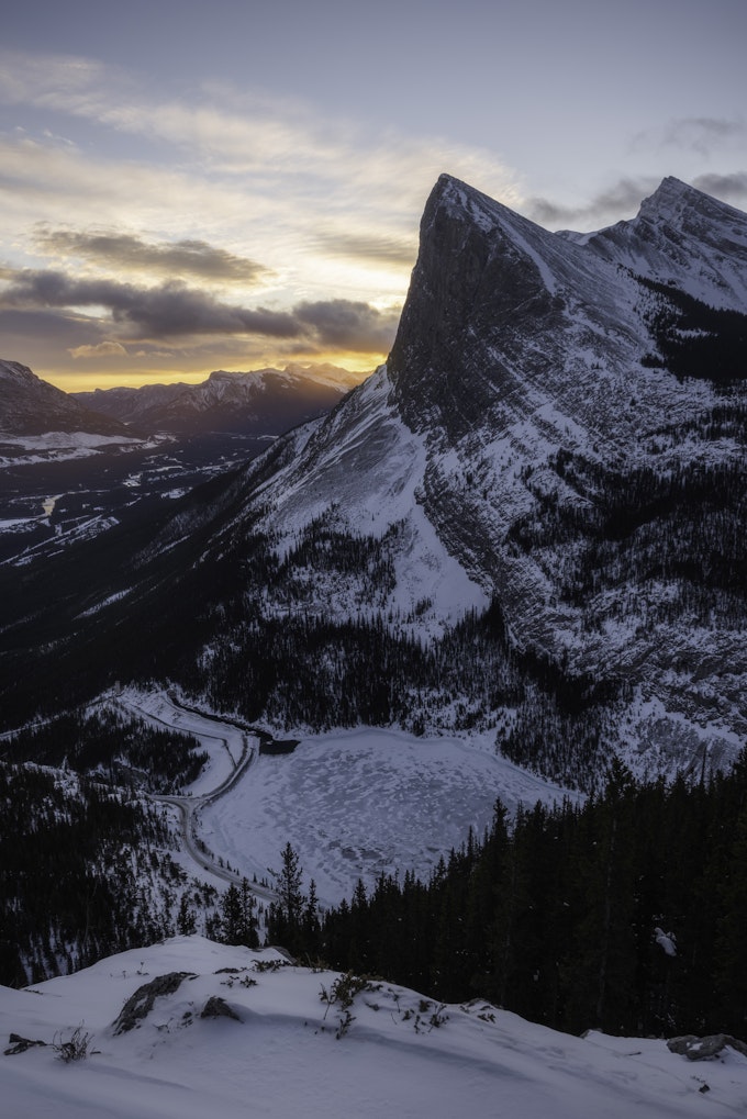 Day one started out with an early morning hike up the East End of Rundle (EEOR) which provides fantastic views of Whitemans Pond, Ha Ling Peak, and the town of Canmore with the sun rising behind the mountain range (Mount Grassi Lawrence) behind Ha Ling Peak. This was the first time I had done a hike like this in the Winter and it was fairly tough! For every step I took, it was a quarter to half step backwards in the snow but the views from the overlook were sensational. The sunlight illuminated some haze in the sky casting an orange glow behind Ha Ling Peak and into Canmore.