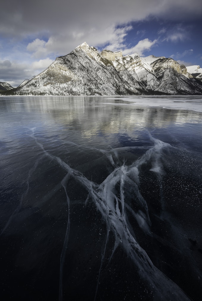 Day two started out with a sunrise along Policemen Creek to shoot the iconic Three Sisters in Canmore. The next stop was at Lake Minnewanka up in Banff. This was the first time I had ever stepped out out onto a completely frozen over lake and it was pretty interesting! I wasn't sure if I could trust that what I was walking over was truly solid underfoot, but it was! The ice cracks created fascinating lines and shapes that worked very well for photography. A piece of advice, make sure you have ice cleats for your feet AND your tripod... Ice is, in fact, very slippery!