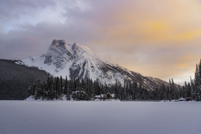 Emerald Lake is a stunning location dominated by Mount Burgess that towers over the Cilantro Cafe and Emerald Lake Lodge. The lodge itself is a outstanding. Numerous cabins dot the peninsula, each with a real wood fireplace to keep warm! For my photograph, I wandered around the lake to shoot the lodge with Burgess towering overhead. I waited for quite some time hoping light would splash through the overcast sky and the patience paid off. Warm pinks and oranges lit the cloud deck and the peak of the mountain just before the light disappeared. The remainder of the evening and following morning were overcast with light snow showers.
