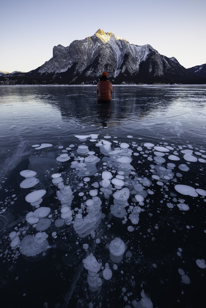 From there, we headed east along the David Thompson Highway for the wintertime famous, Abraham Lake. The lake sees fairly consistently high winds which blows the snow off of its solid ice surface revealing unbelievably surreal cracks and the famed methane ice bubbles. These bubbles form from the decomposing vegetation along the floor of the lake and in the Winter, become frozen in time. Abstract compositions were everywhere to be found and it was a truly awesome experience. I was also extremely pleased how this composition came out below! I found some bubbles I liked, took my shots for focus stacking the foreground, and then set my camera timer to walk out and frame myself below the last light of the day hitting the summit of Mount Michener.