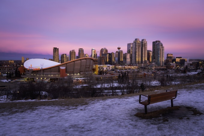 This sunrise went nuclear! The sun was actually rising behind me as you can see in the reflection on the high-rises with the yellows and oranges but out to the west, the sky exploded with pinks and purples. It was a fantastic start to a day spent exploring the city including going up the Calgary Tower where there is a 360 degree observation deck with a glass floor segment. I always enjoy grabbing food from the local shops and the two favorites I found were Red's Diner and Blue Star Diner. My last evening was spent catching a Flames game at the Saddledome, pictured above! I am a big hockey fan, so this was a lot of fun. Sadly, the game all but concluded my Winter experience up in the Canadian Rockies.