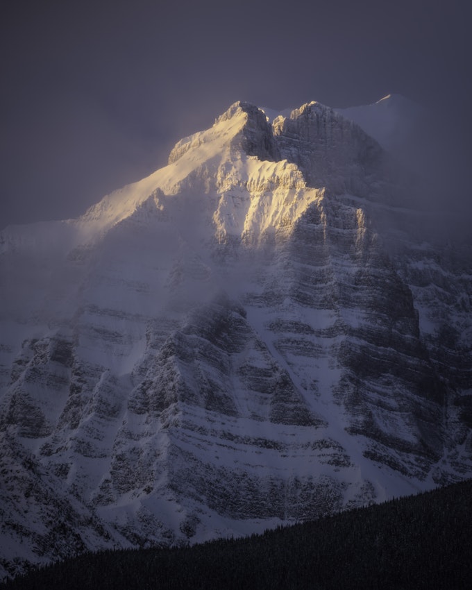 As the sun rose, a small break in the clouds illuminated the southeastern face of Mount Temple (my personal favorite mountain as I am a Temple University grad) with warm morning light. The face was surrounded by atmospheric conditions of cloud, wind, and snow that really softened the morning glow.