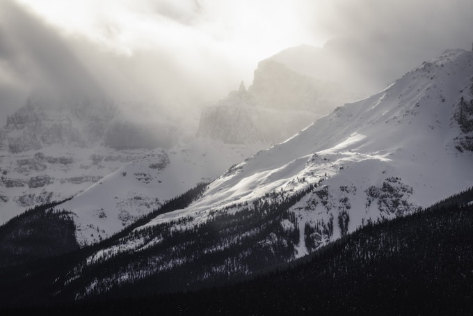After grabbing breakfast and warming back up a bit, we packed our gear up to make our way up the Icefields Parkway. We stopped at the Saskatchewan River Crossing to take some telephoto shots of the distant mountains. I was able to capture this image below where this relatively small spire was silhouetted behind the light rays shining through the atmospheric sky, hitting and illuminating the peaks and slopes in front of it. They seemed to glow! It was a spectacular scene of quickly fleeting light that I was glad to have captured.