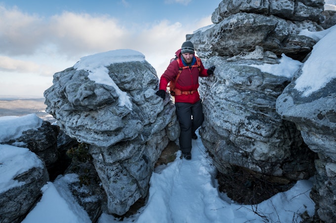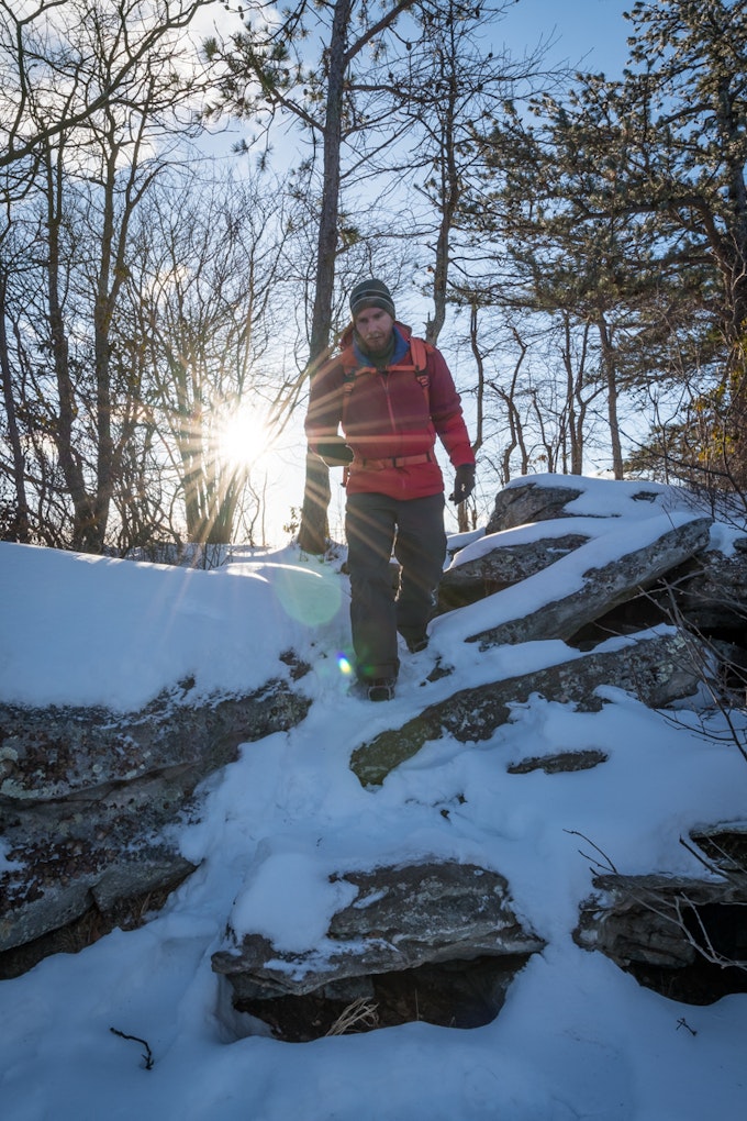 After exploring the area, I took in the view one more time and started hiking back down the mountain. The hike along the ridge was even better on the way back because I could see through the leafless trees the layers of the mountain ridges of both Virginia and West Virginia. Once I got back into the trees, the wind died down, and with the sun now up I started to shed some layers. One of the things I really like about the Marmot Featherless Component Jacket is it’s actually two jackets: a waterproof outer shell and a featherless insulated jacket that zips together forming one all-purpose jacket. Because of this, I was easily able to unzip the outer shell and stuff it into my backpack. Even though this was my first time hiking up to Big Schloss, I know it will not be my last. Not only does it have an amazing panoramic outlook, but the trail also has some great views along the way, and I cant wait to go back to photograph the area in different seasons.