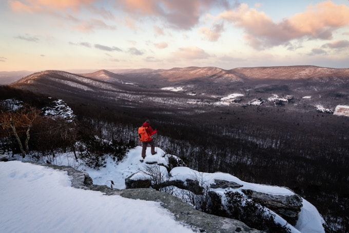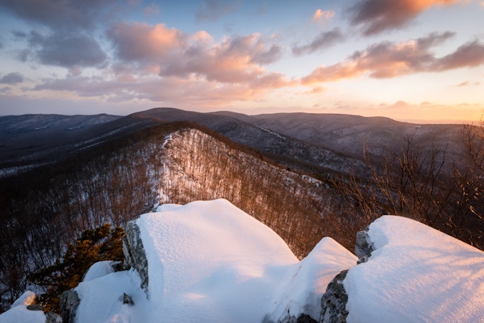 Last weekend, as most of my fellow landscape photographer buddies stayed up late to photograph the blood moon, I decided I was going to head to bed early so that I could wake up at 2:30am to photograph the sunrise. I wanted to capture the snow covered Appalachian Mountains, but the snow didn’t come as far east as predicted. The snow mostly fell in West Virginia and in northwest Virginia. So I decided to hike a trail that has been on my list for a while now, which winds along the Virginia/West Virginia border through the Ridge and Valley Range of the Appalachians so that I could capture the fresh snow fall (click here for landscape photo tips). Checking the weather before going to bed, it was calling for scattered low clouds to blow in about two hours before sunrise and then completely blow out about two hours after sunrise. Low clouds can be tricky because if they are in the wrong spot, they will block the sun as it rises, resulting in little-to-no color. Since the weather was calling for scattered low clouds, I figured I had a 50/50 chance of getting a colorful sunrise. With my plan in place, I went to bed.