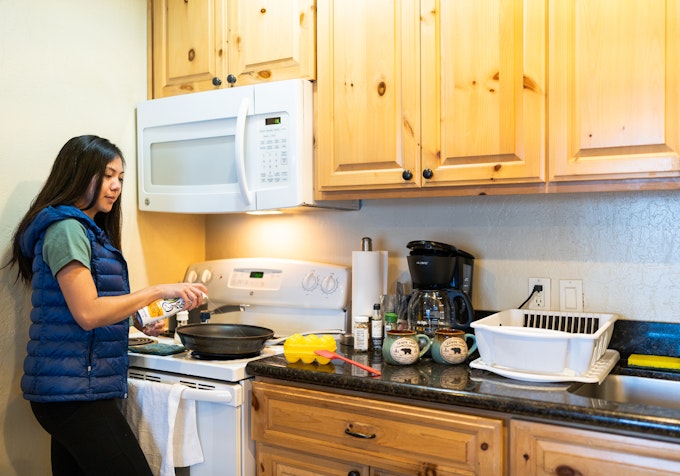 Waking up in the coziest bed made it a bit difficult to embrace the winter chill, but the breathtaking views just outside our front door gave us the motivation to get moving! The kitchen was fully stocked with a fridge, cooking gear, and cleaning materials, allowing us to make home-cooked meals every day.