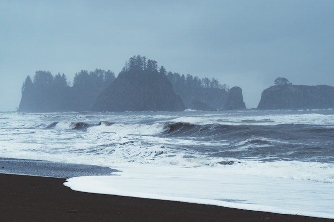 continue onward west towards the coast. Rialto Beach was first up. It's kind of a bummer but we didn't get to explore too much here. The weather had thickened with rain and not wanting to destroy my camera I didn't stay out long. With that being said I did get to step onto the beaches made of black rocks. You just get kind of "horror movie" feel out there. Either way our first beach with giant rocks, so I was happy!