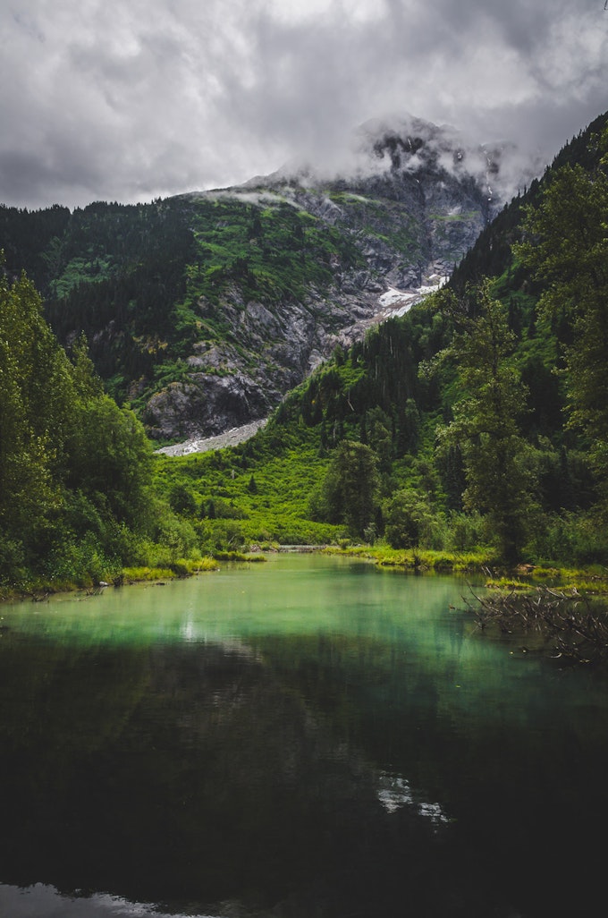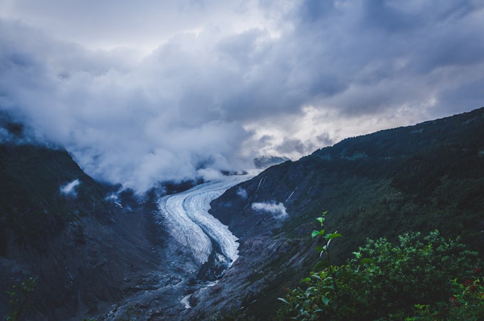 This was the only view I got of Salmon Glacier on my first day/night. Moody clouds at the glacier toe.