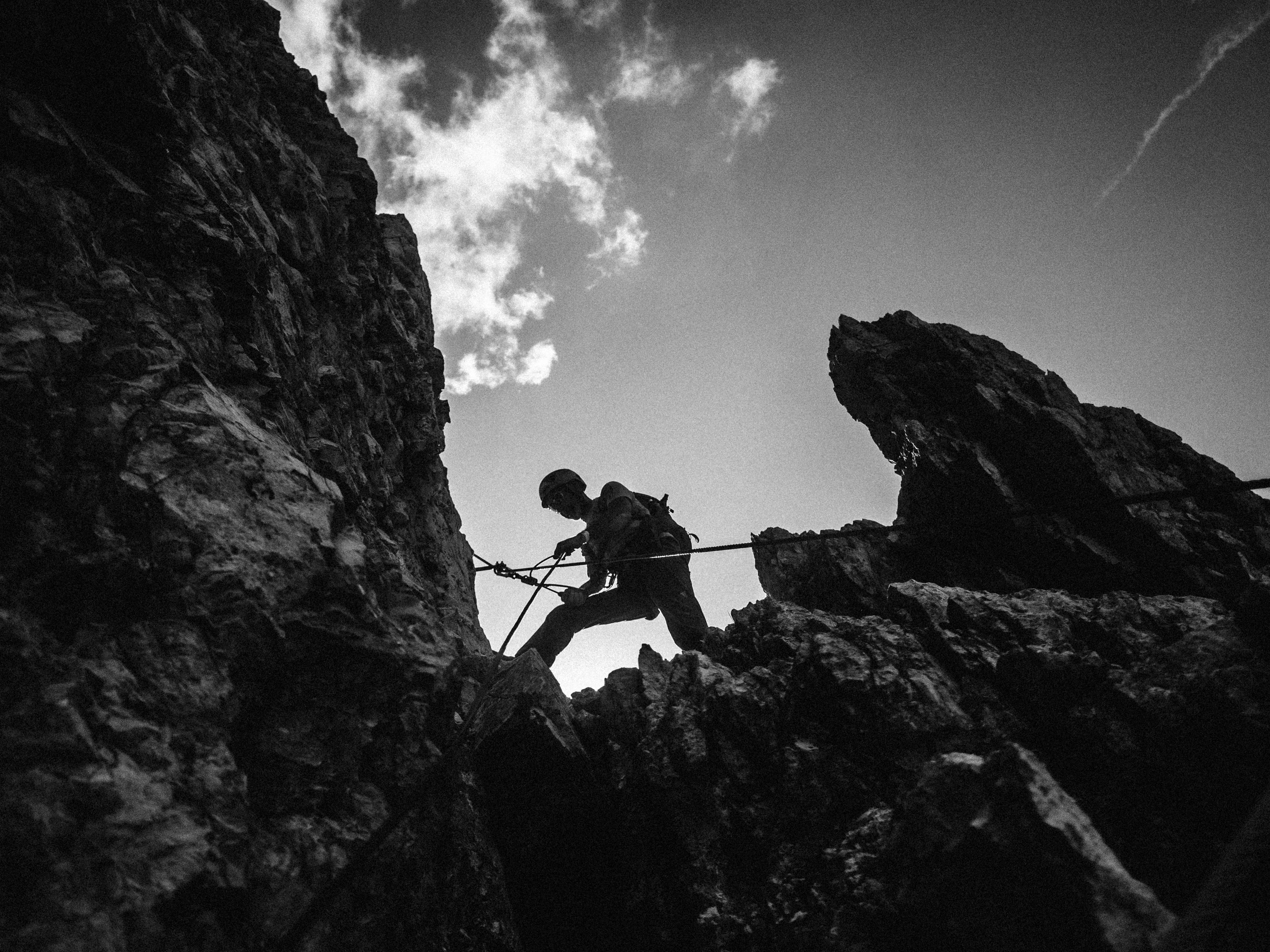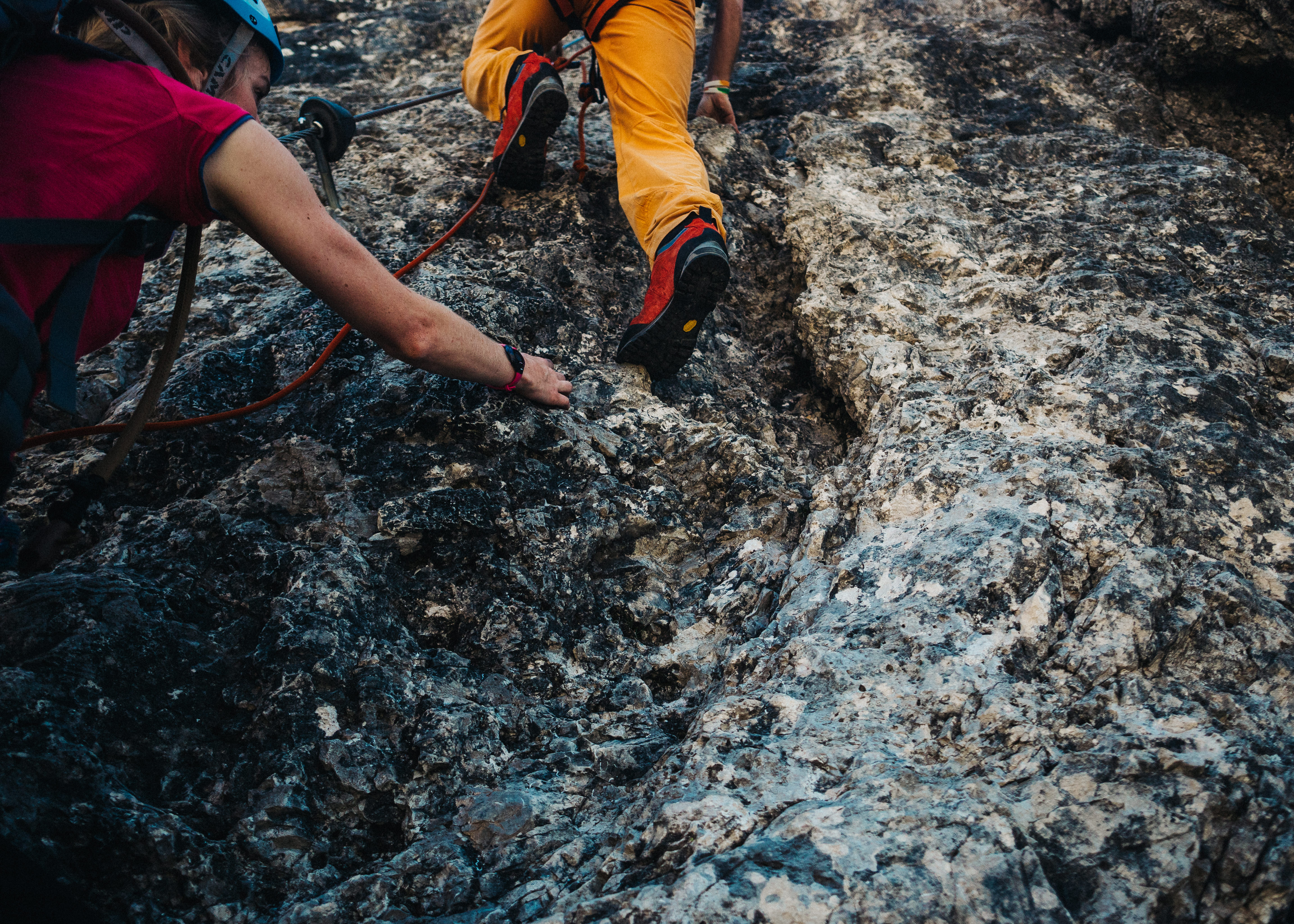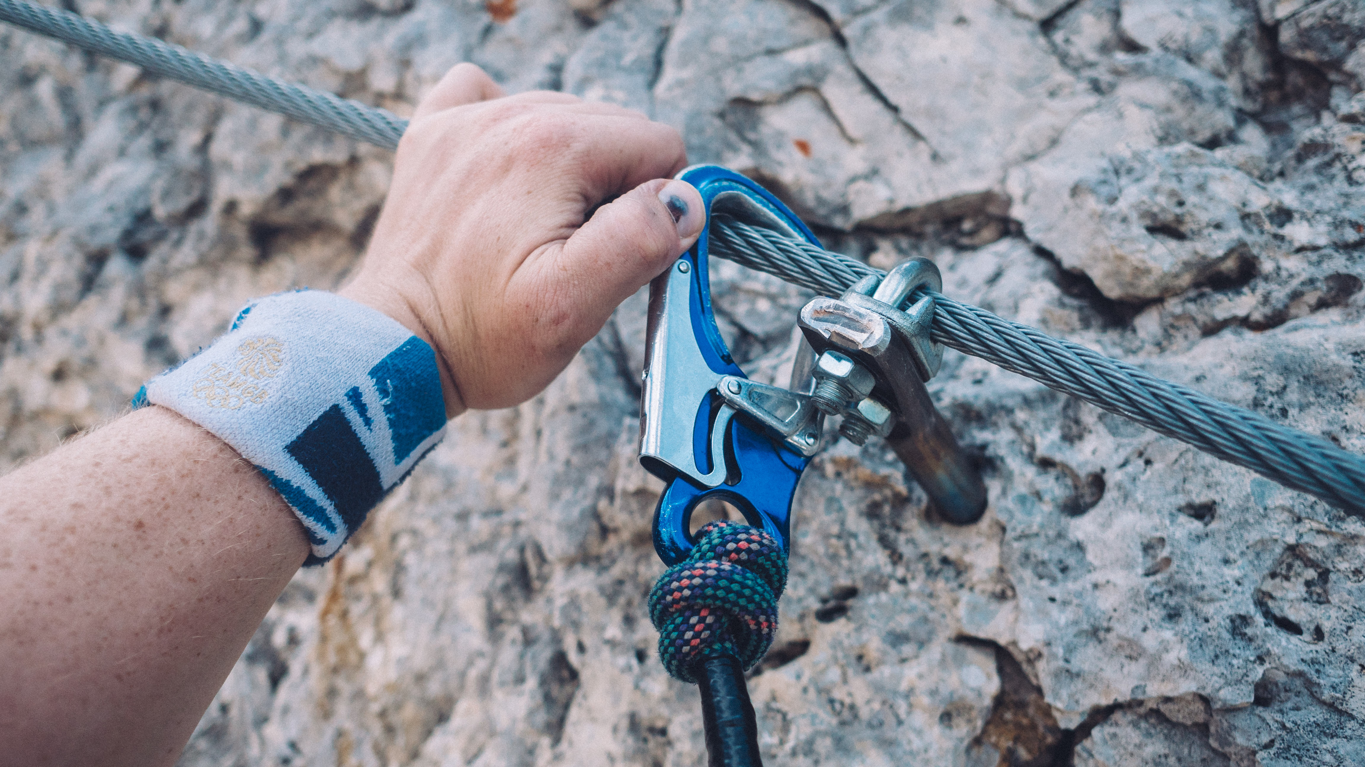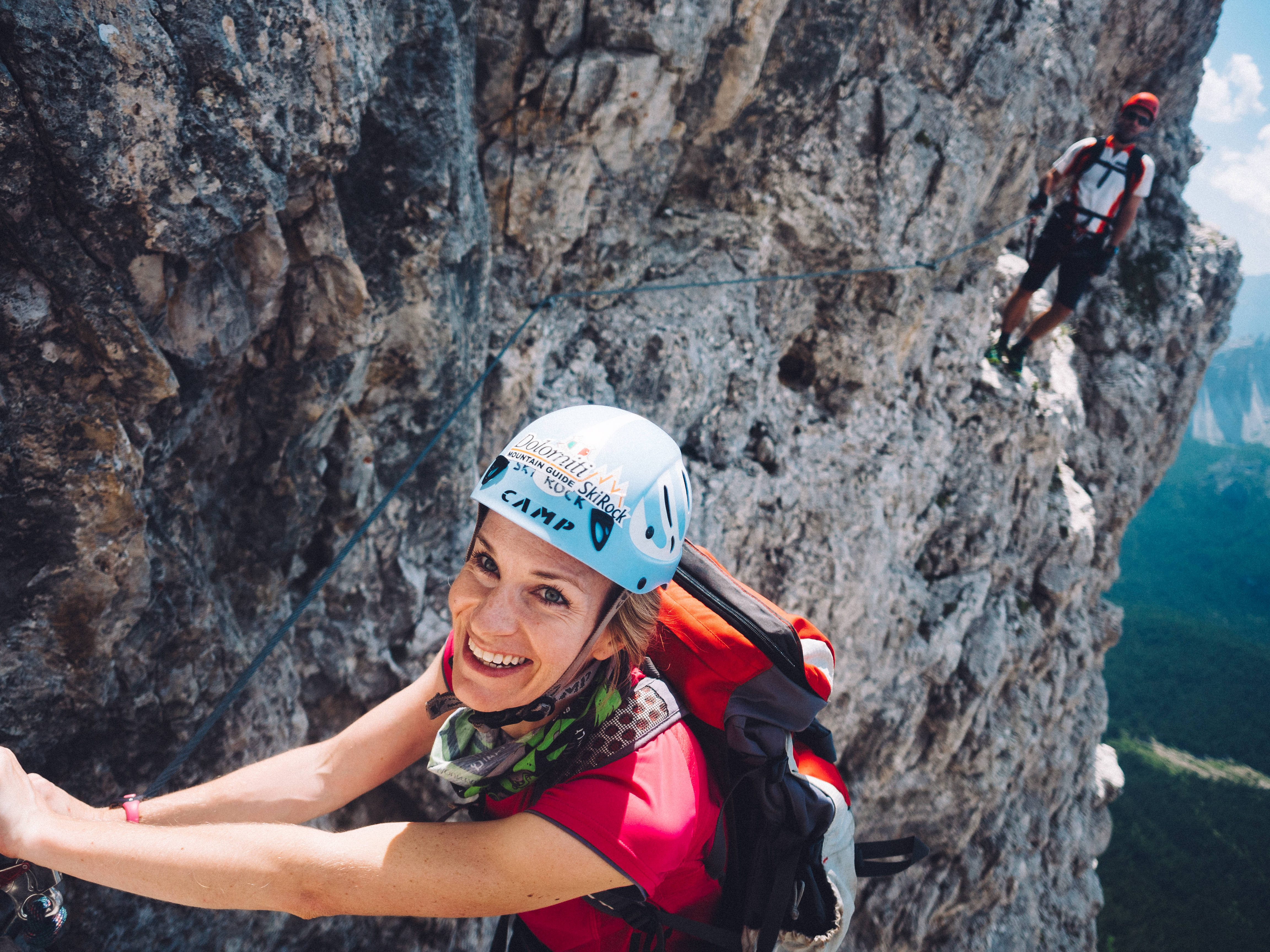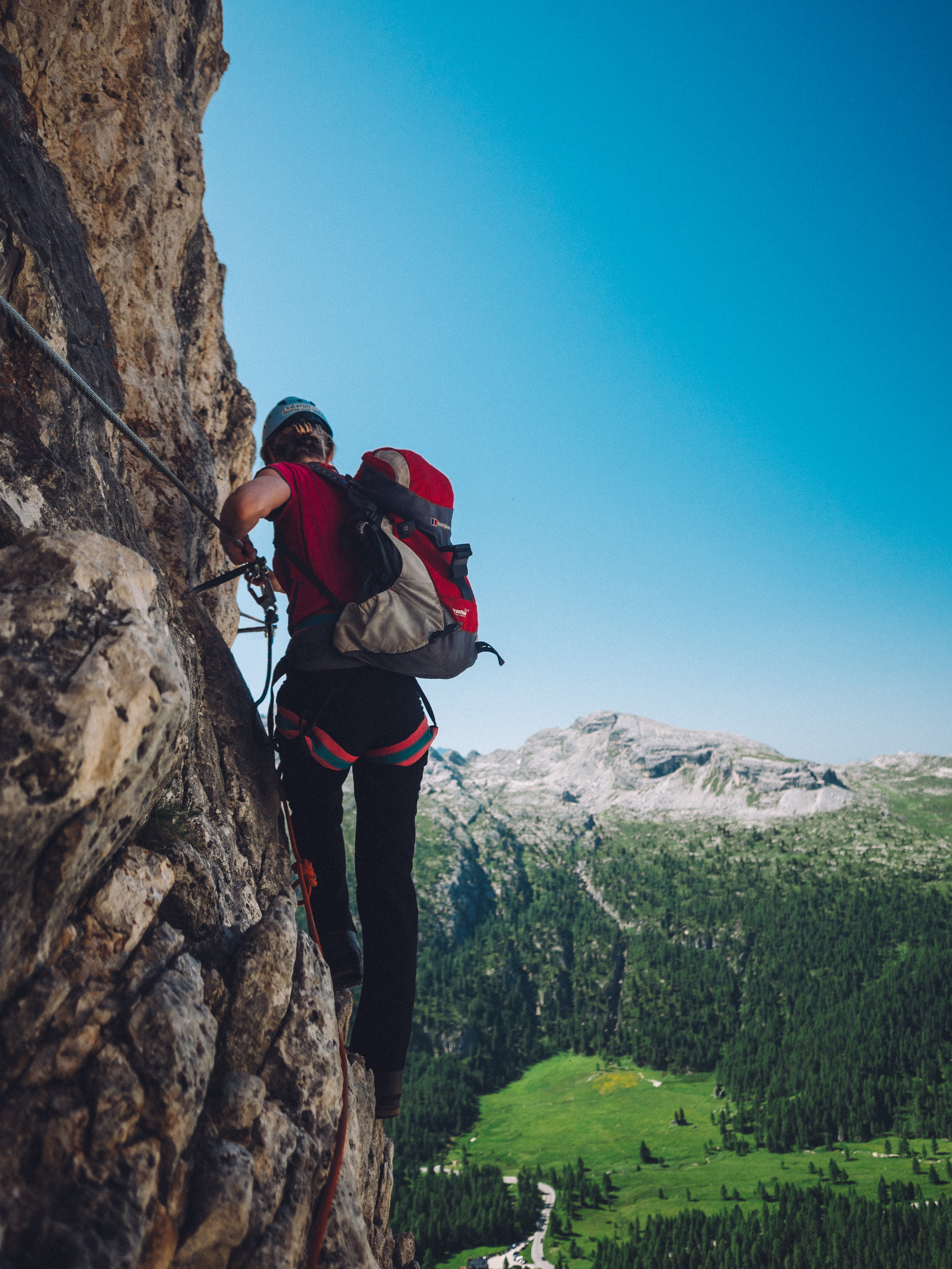 We thought our first go at via ferrata was going to be easy. Maybe I overstated our experience in the phone call with the organisers, because when we arrived at the base of the climb, we were surprised to be faced by a vertical wall of rock. We put on our harnesses and helmets, and as Mario checked our kit, Lucy looked at me with an expression that could only mean one thing: