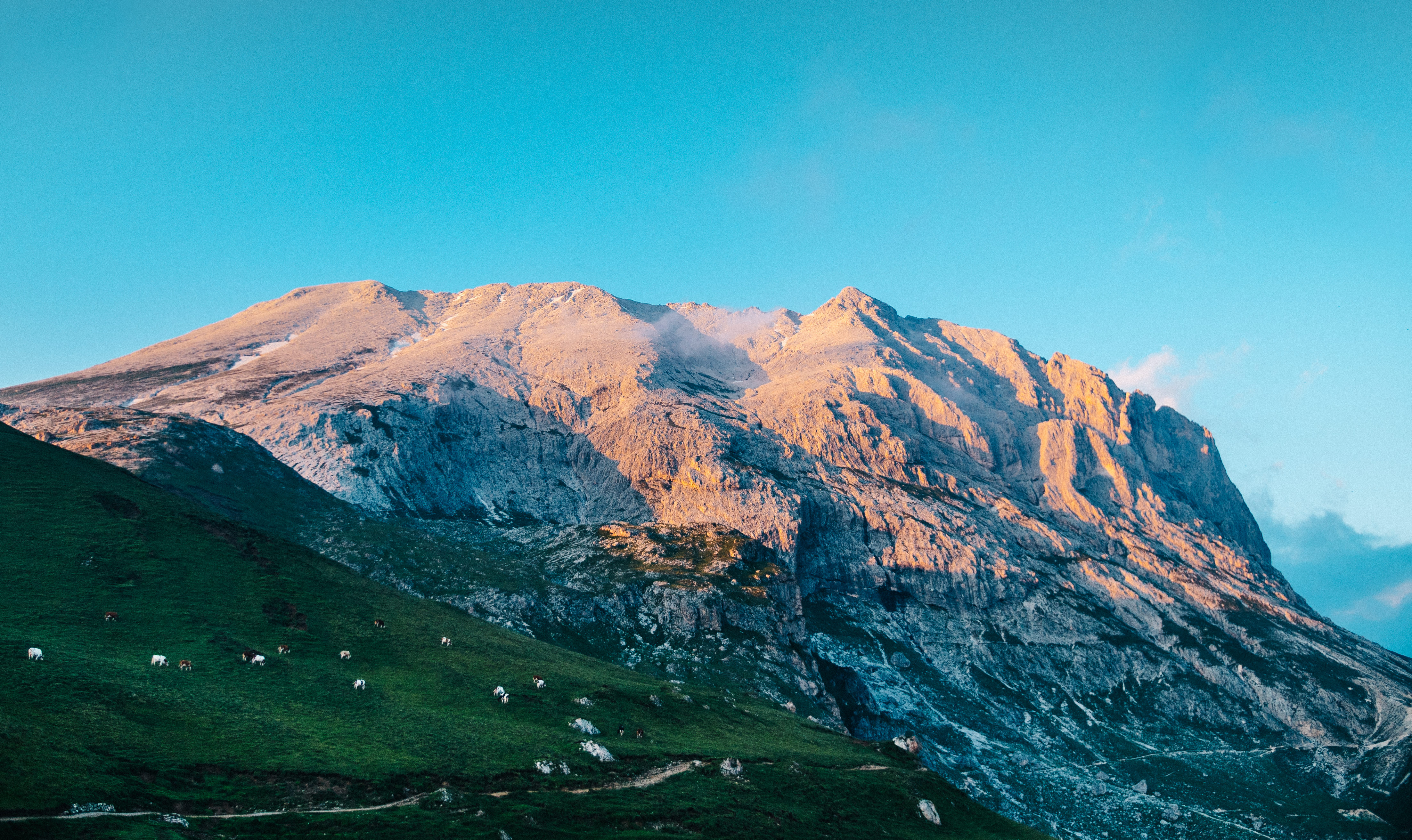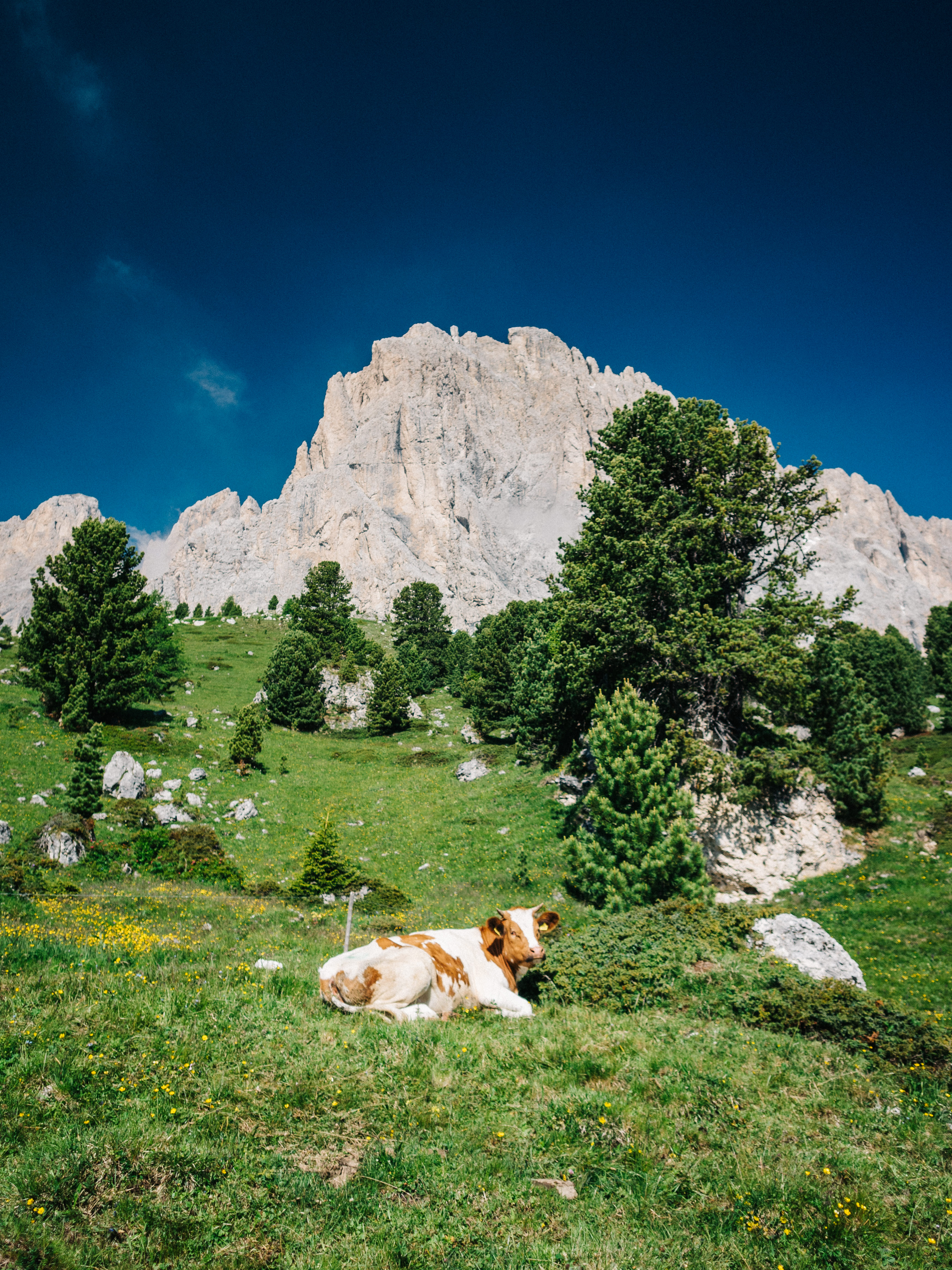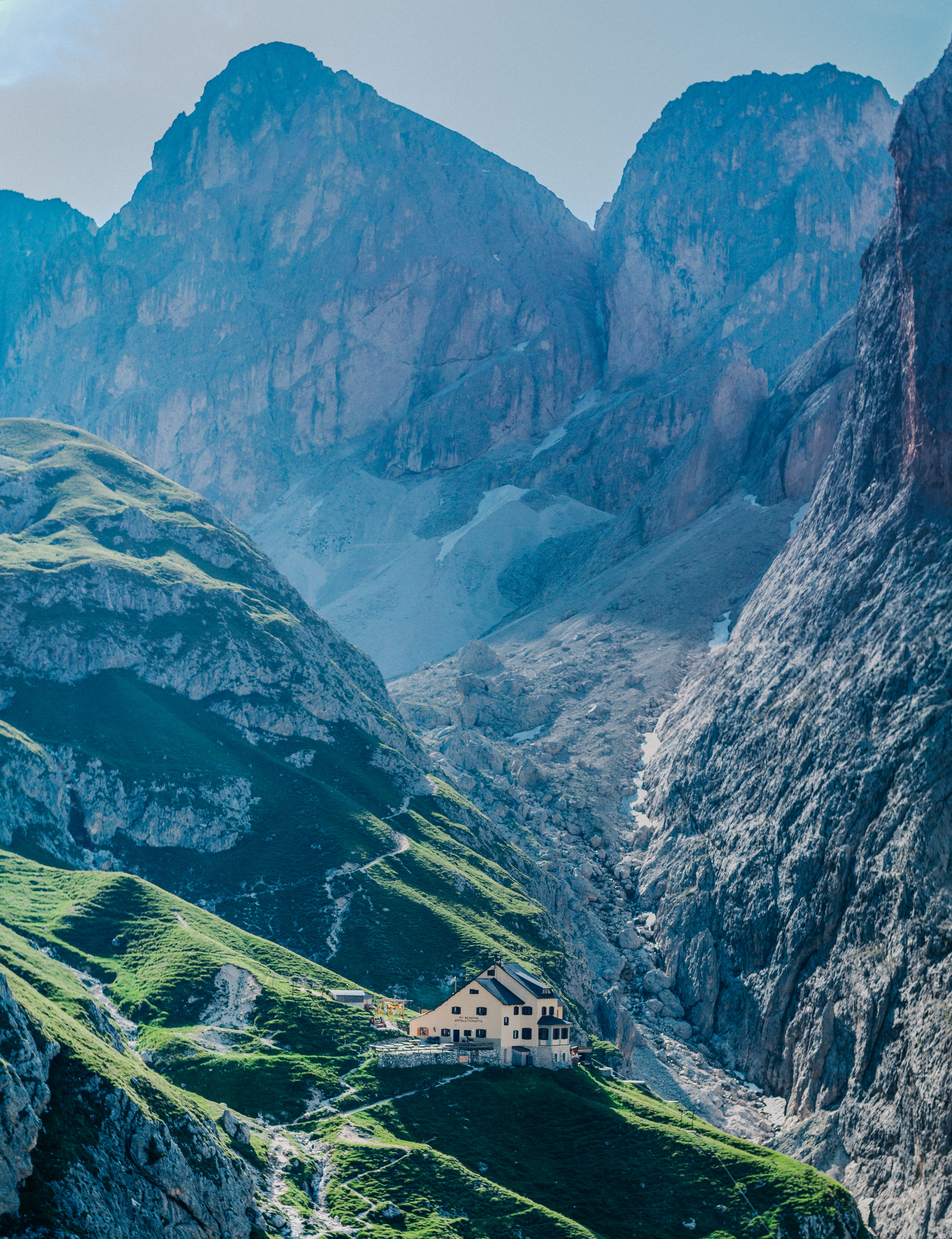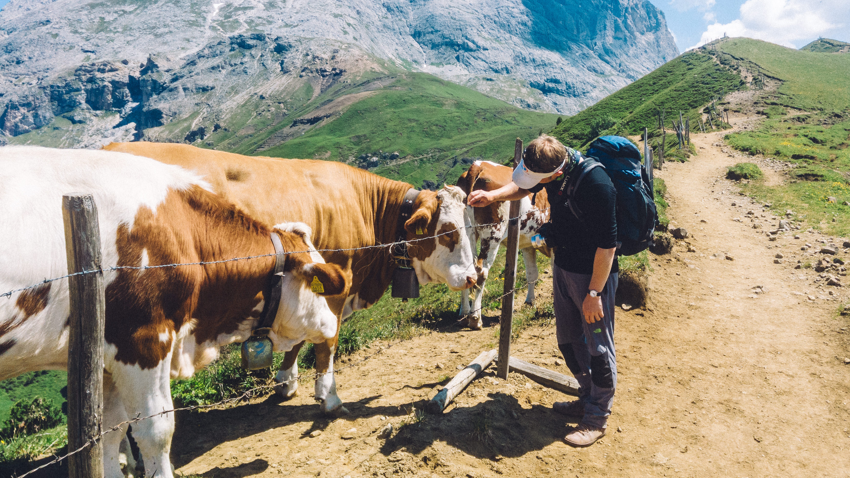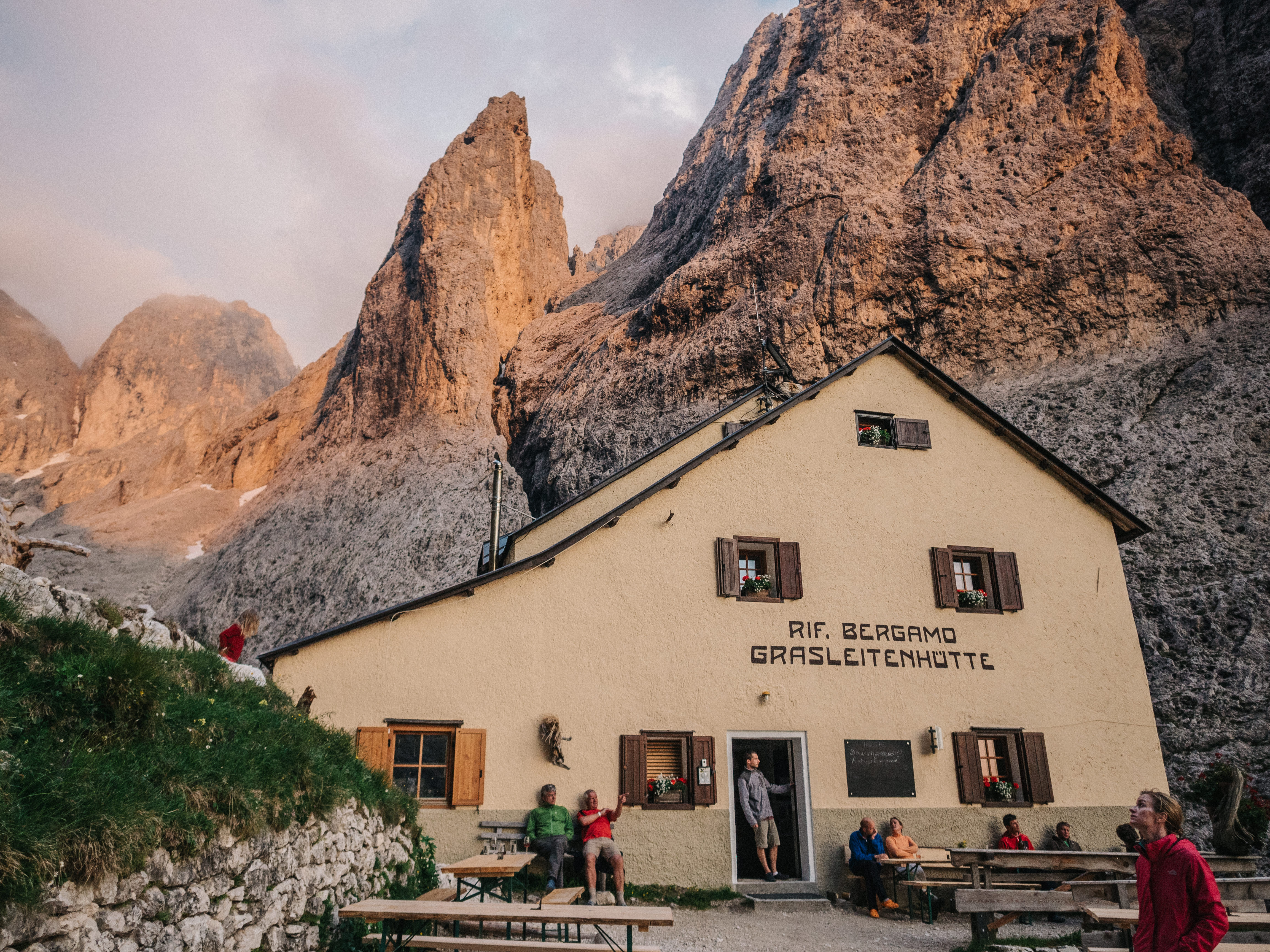 Rifugio Bergamo was our final destination of the day, nestled in the Rosengarten (Catinaccio in Italian), another massif in the region. As you’ve probably guessed, it means ‘Rose Garden’ in German, and refers to a traditional legend of King Laurin, explaining the outer appearance of the range. At least that’s what Wikipedia says. We moved through a green landscape populated by cows and horses, all game for a good scritch. I do have video of me scritching a cow. But that’s for personal use only.