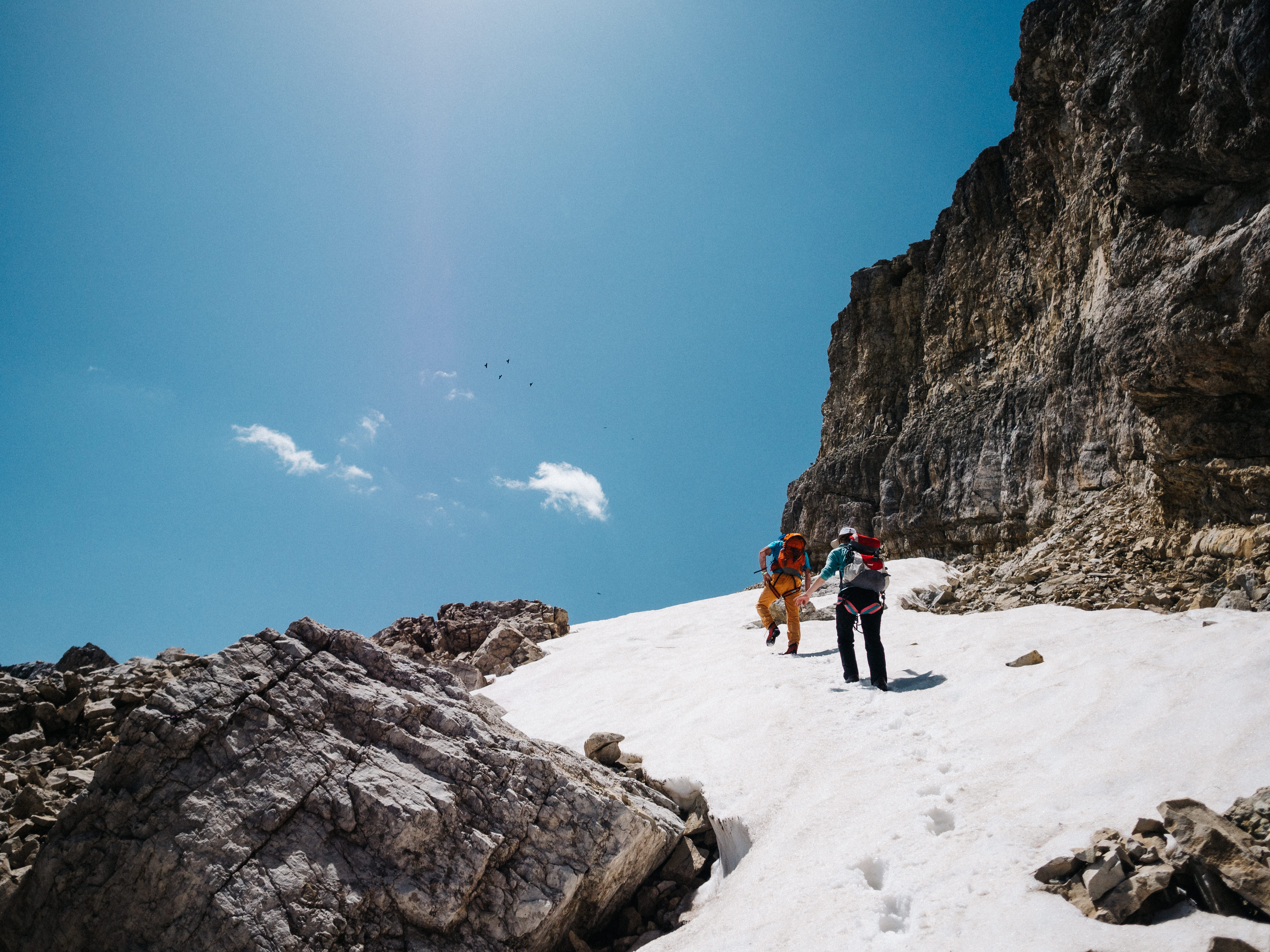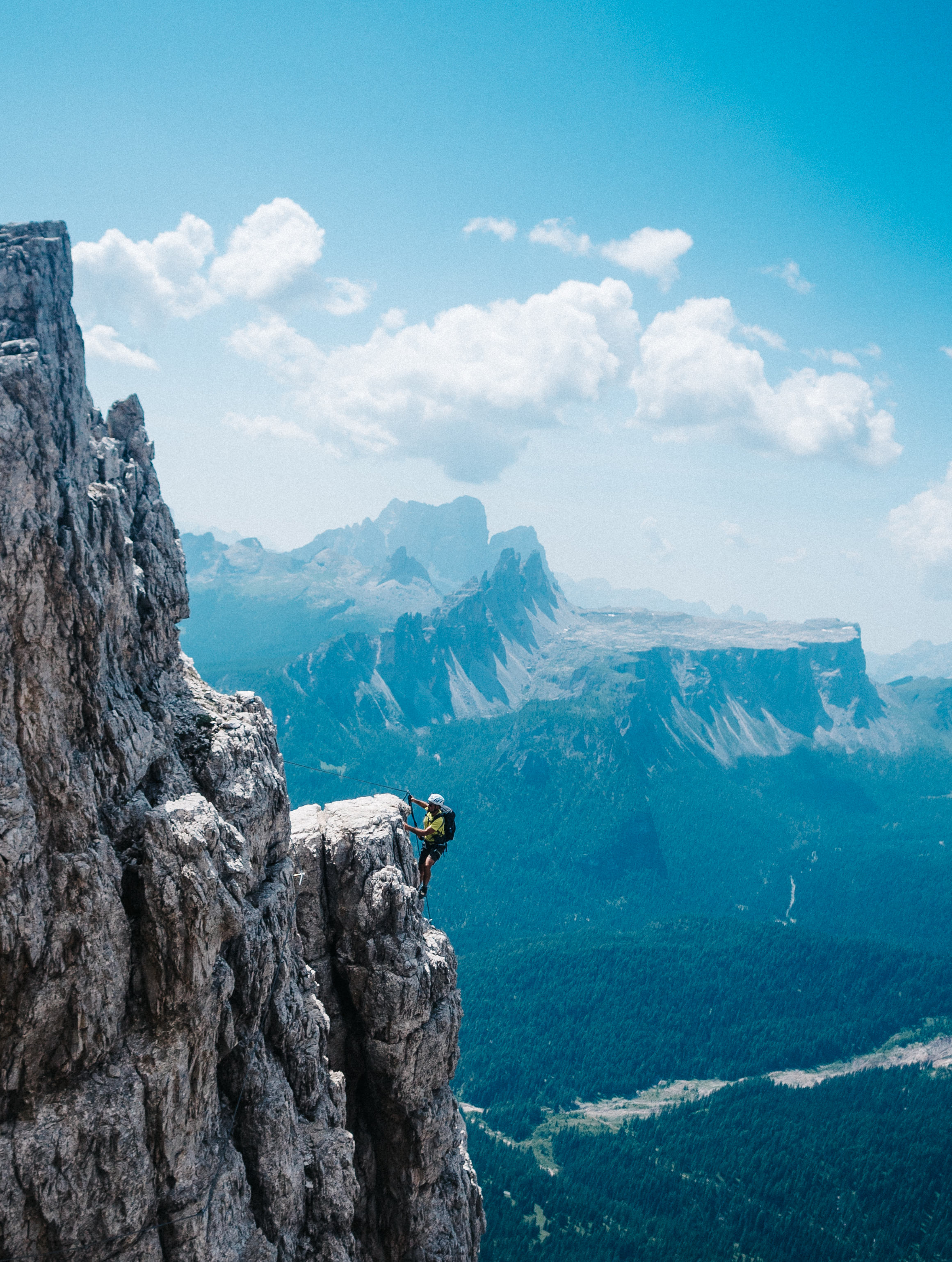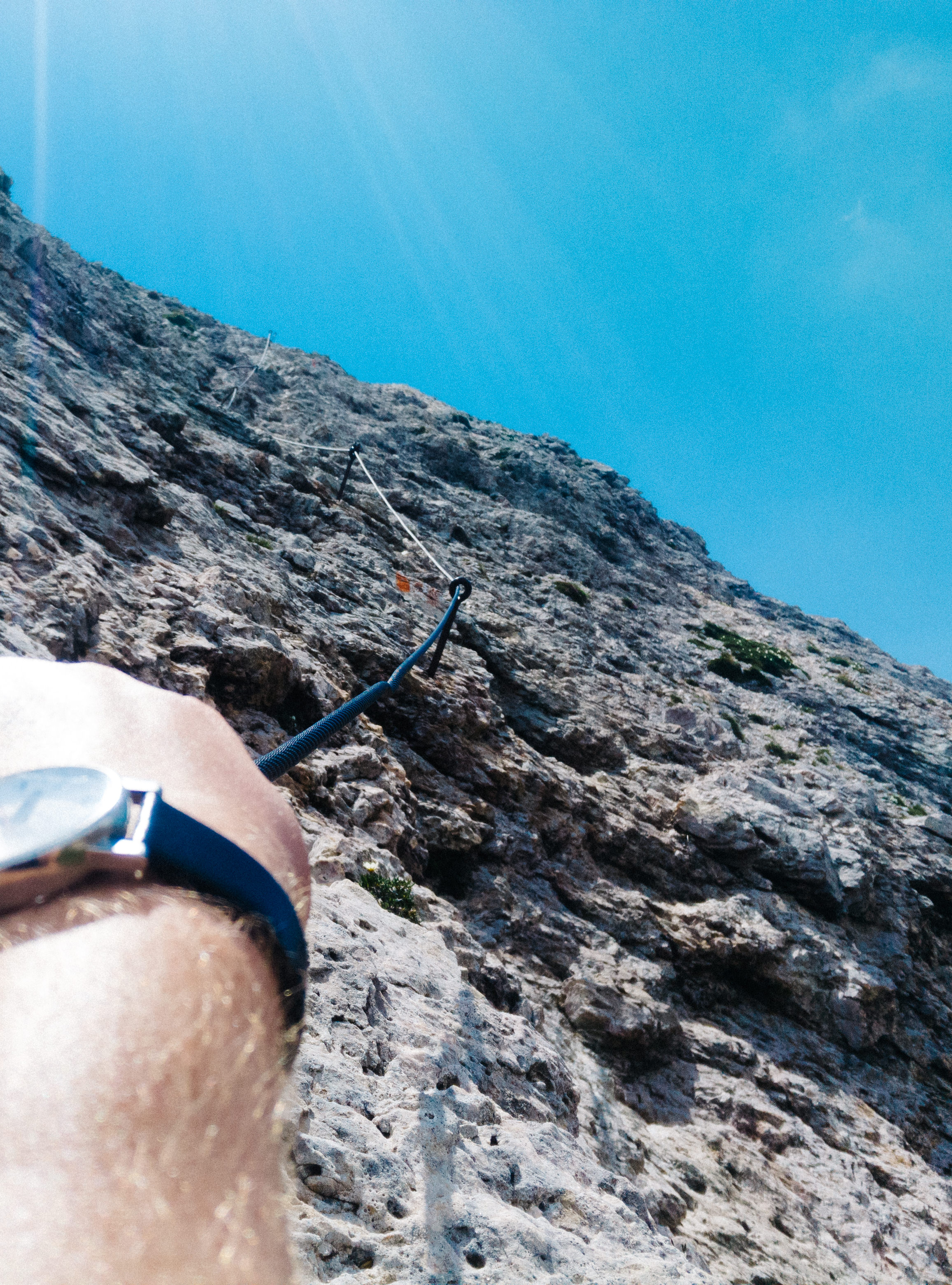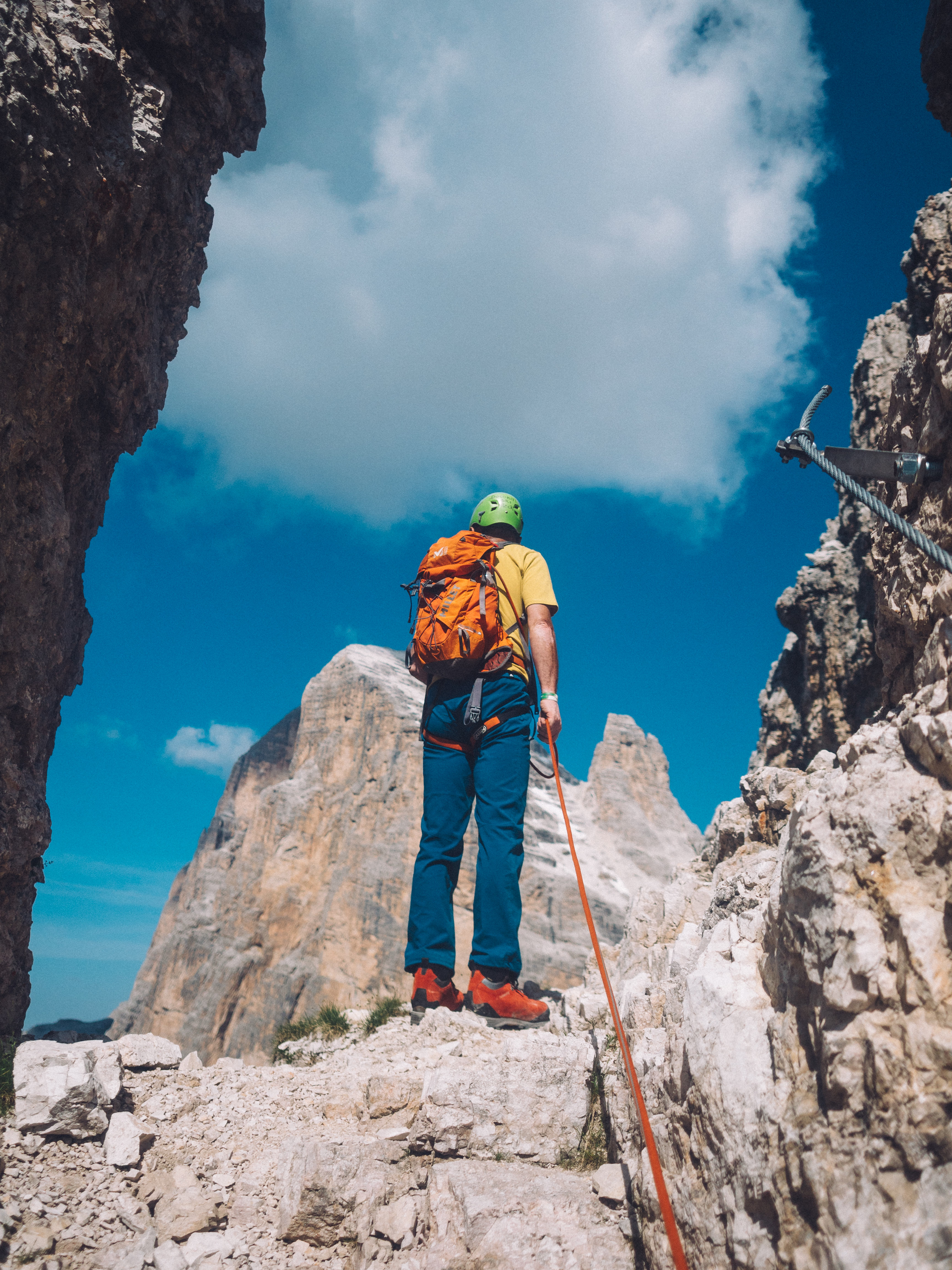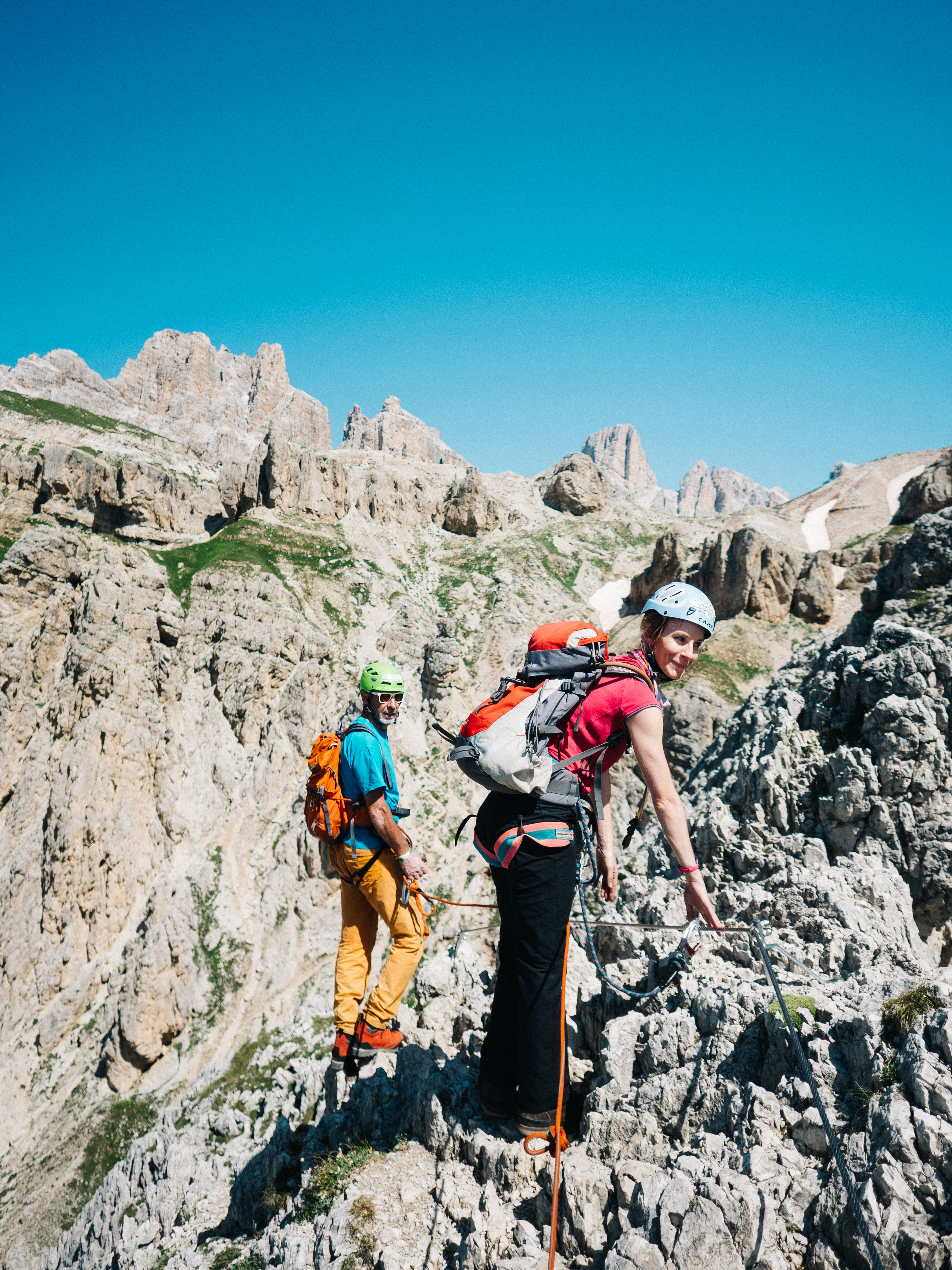 The tour we chose comprised four days of hiking and two days of Via Ferrata, which translates as ‘Iron Road’ (or path, depending on who you talk to). It’s essentially a route following a steel cable that’s intermittently fixed to the the side of the mountain, allowing normal non-mountaineer folks like us to pretend we’re being all adventurous and death-defying. You’re clipped in via carabiners and secured with various ropes and what not, so it’s really pretty safe.