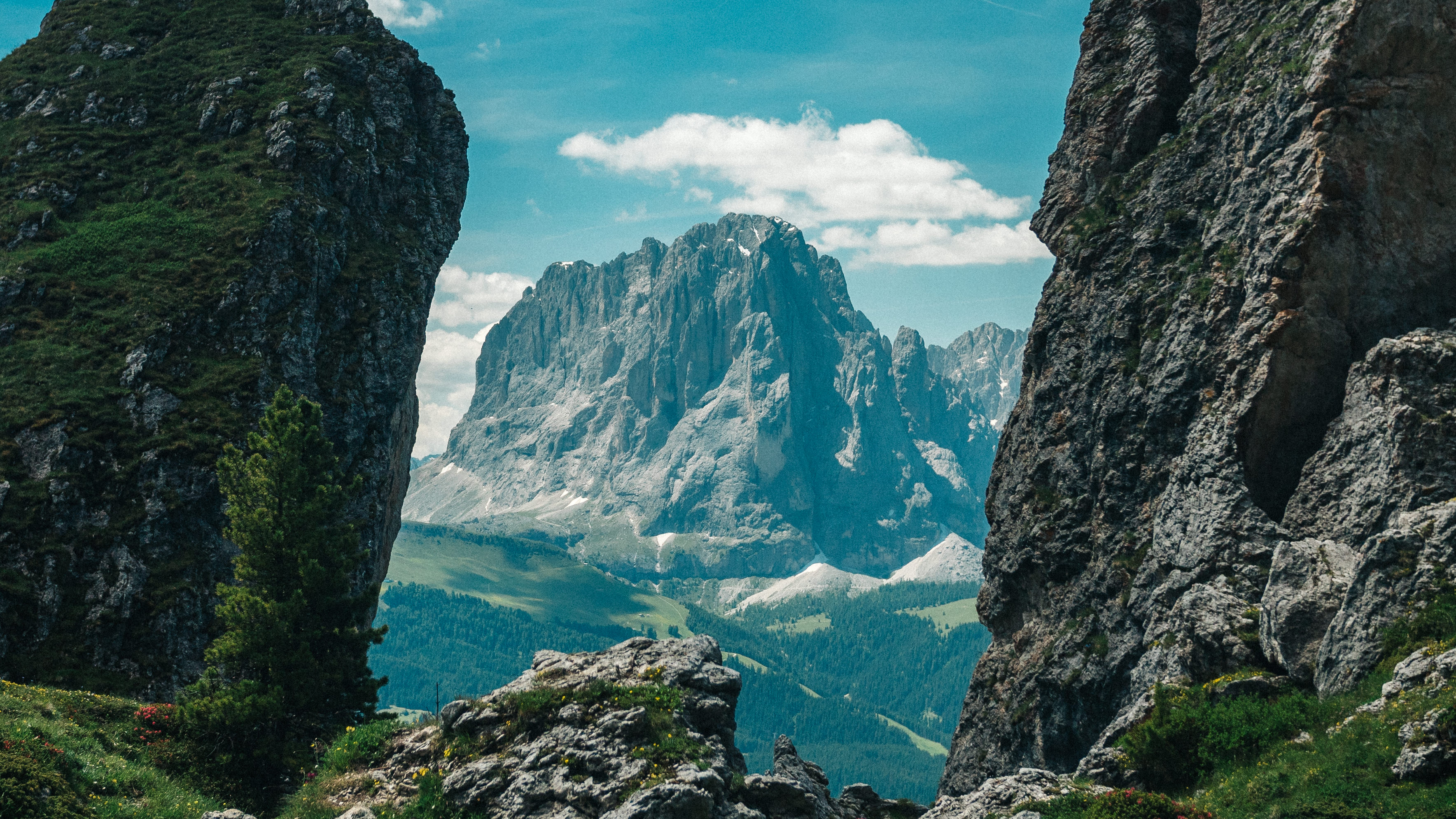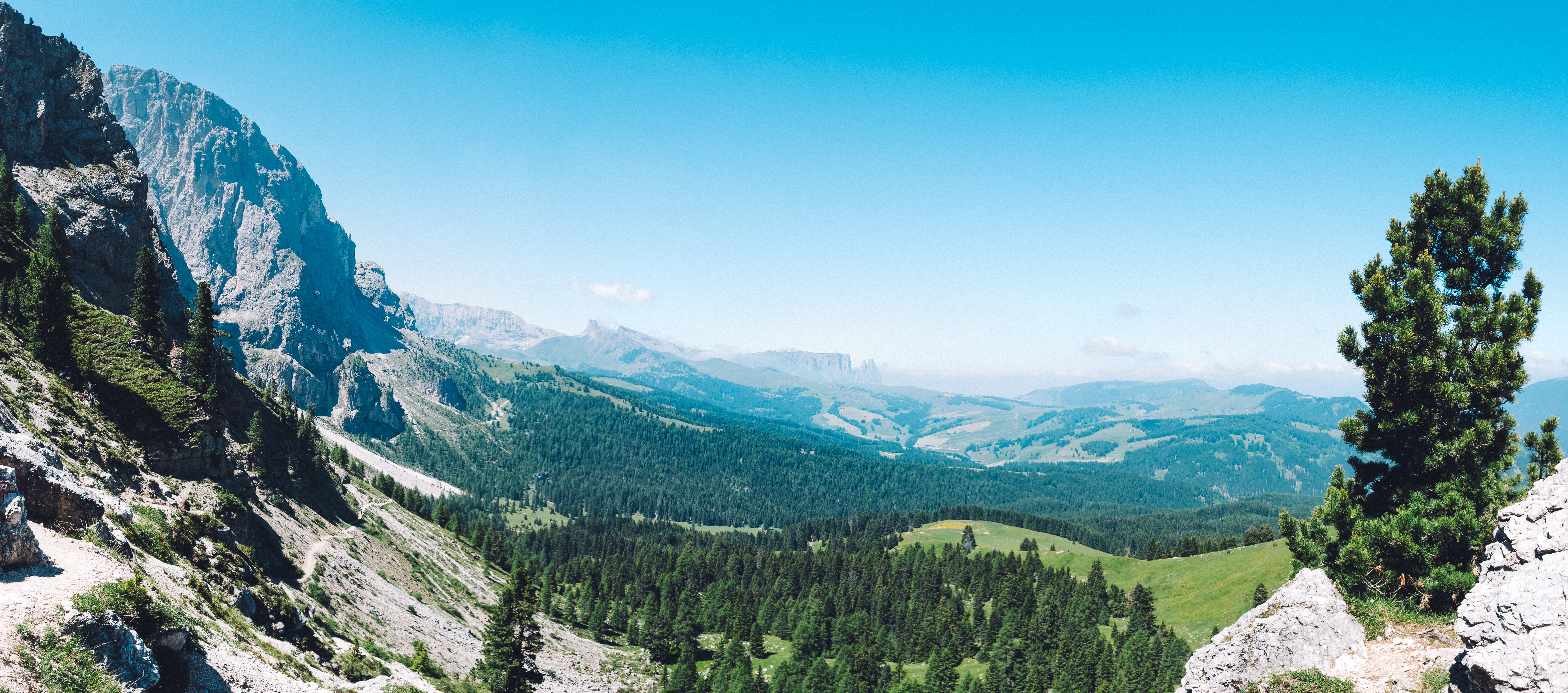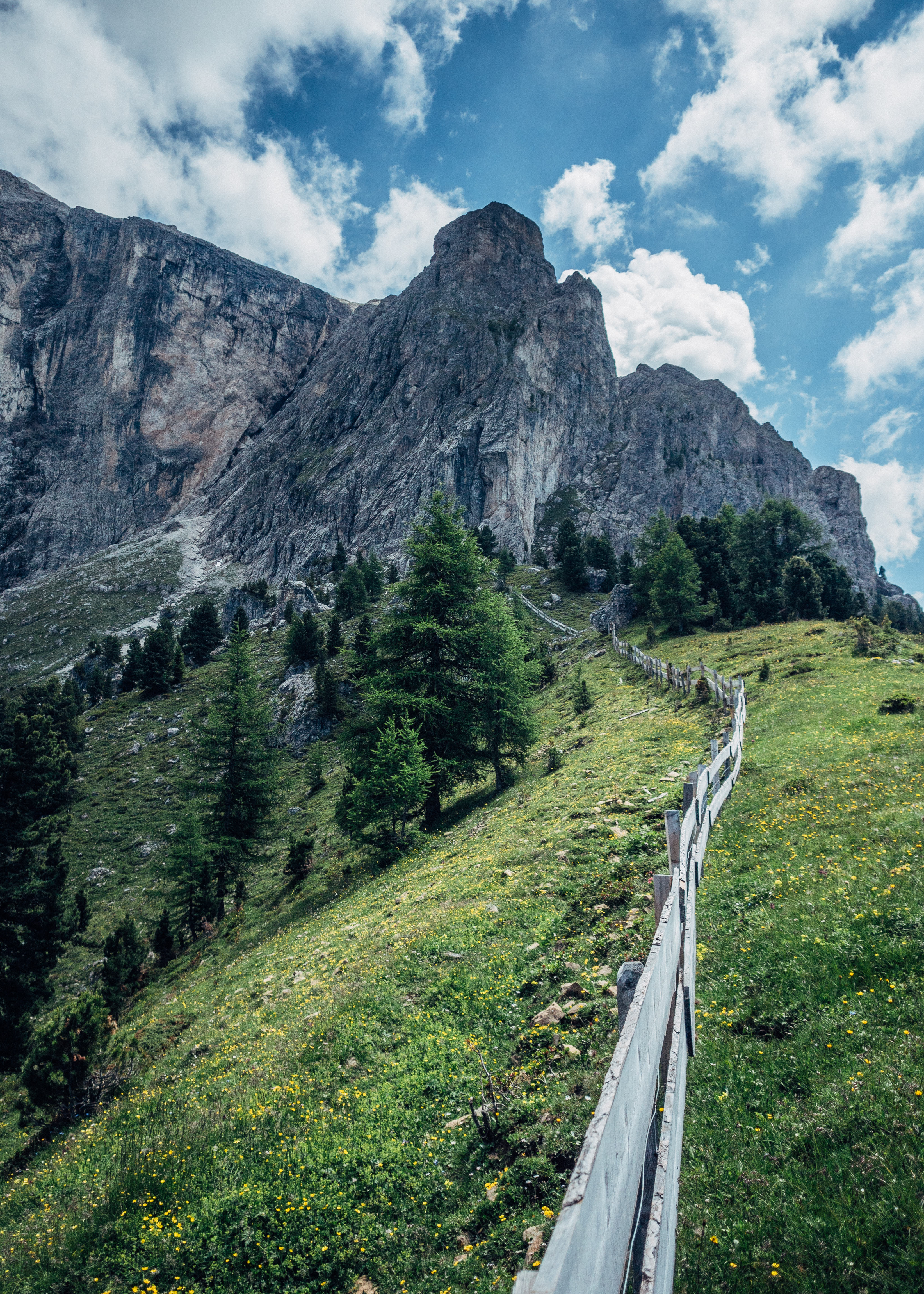 We walked anti-clockwise round the base of Sassolungo, through meadows and woods, and into the rocky heart of the massif.