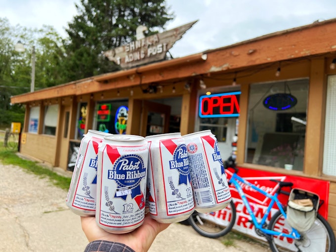 The view of Big Blue Lake from the campground also made a great lounging spot for the day. We played cribbage next to the lake and took leisurely walks around the campground and lakeside park to kill the time. Our campsite hosts had mentioned a corner store a short mile-long ride up the road. I jumped on my bike around noon to check out the store and returned with a six-pack of only the “finest” beers for us to enjoy the rest of the day: Pabst Blue Ribbon.