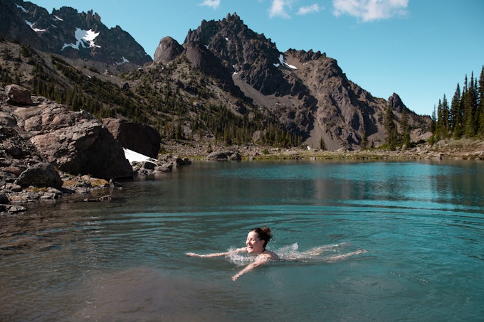 When we reached the upper basin, we took a dip in the water (refreshingly cold!), enjoyed a few summit beers, and ate dinner as the sun dropped down below the horizon.