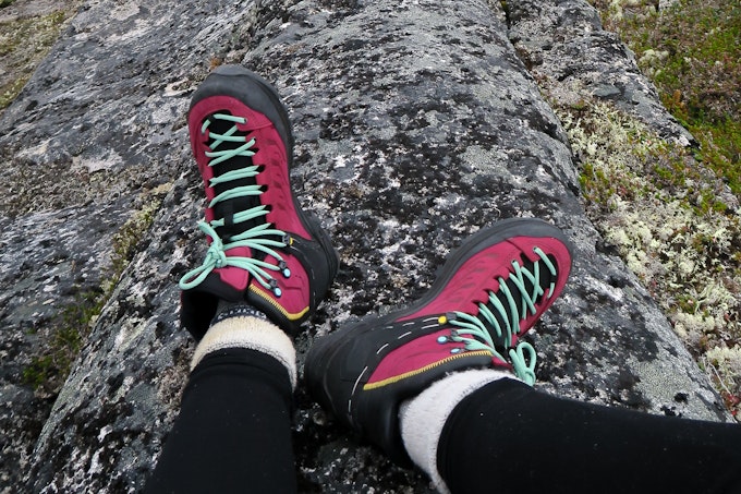 While fumbling along scree hillsides, through jumbled roots of ancient forests, and over pointy granite boulder fields, I was thankful for the full rubber rand found above the sole that protected my toes from painful missteps. Despite hiking for hours on uneven ground that would normally send me tumbling, the sturdy Vibram sole, with what felt like a shock proof midsole, along with serious ankle support allowed me to take each step confidently.