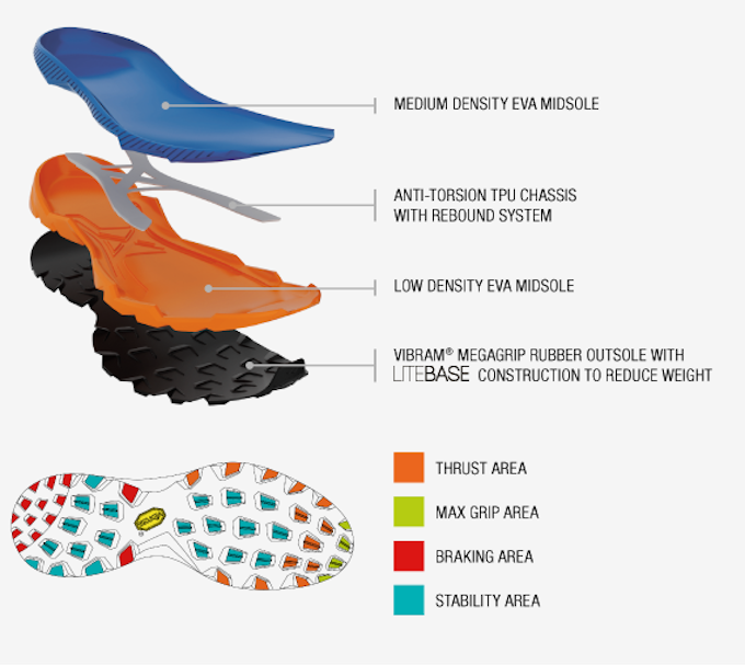 Enter the SCARPA Spin RS. The dual-density EVA midsole provides amazing stability and helps provide power back to your stride, and the Vibram Megagrip rubber provides traction on any surface. The sole features four different shapes and sizes of tread lugs to provide traction on any surface, in any direction, and to help keep pesky dirt and mud from sticking to the bottoms of the shoe which weighs you down and provides unnecessary stress on your joints. Anyone who's ever tried to hike or run with shoes caked in 5 extra pounds of mud can appreciate what a helpful feature this is.
