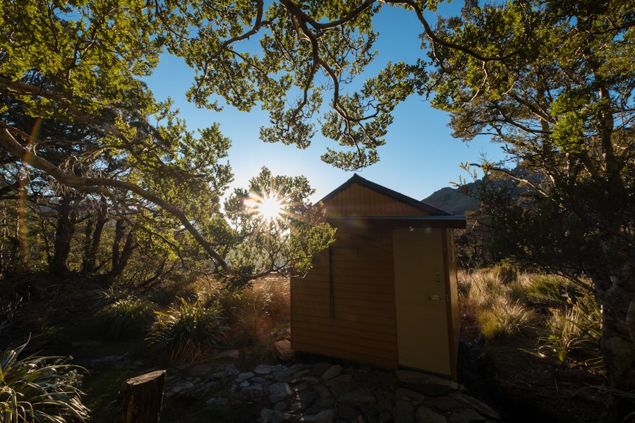 The sun dips toward the western mountains – everything is backlit in gold. The very trees seem to sparkle as they’re caught in the glow. I’m sitting facing west, outside of the yellow Lonely Lake Hut drinking in the beauty around me. Tui sing beautifully in the tops of my favorite trees – silver beech – and the sound of their wings is a stirring flutter. The dipping sun makes the intricate rock of the surrounding mountains stand out in sharp lines and texture. The tussock is gold, the hebe flowers white in contrast, the tree branches are spring green. The day is long, the sun is warm, and the lake is calm.