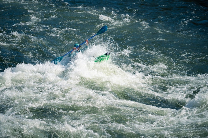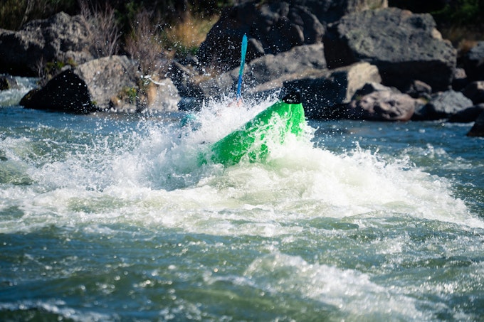 I pushed onto the river and into the right channel. I angled my boat 45 degrees to the river so that I could pull to the left if needed. The river carried me closer. My line came into view. It was narrower than expected, but I had time to adjust. I pushed forward a couple strokes and got lined up. The current pulled me towards the drop. I pulled back to the left and onto the tongue, the back of my boat barely missing the island.