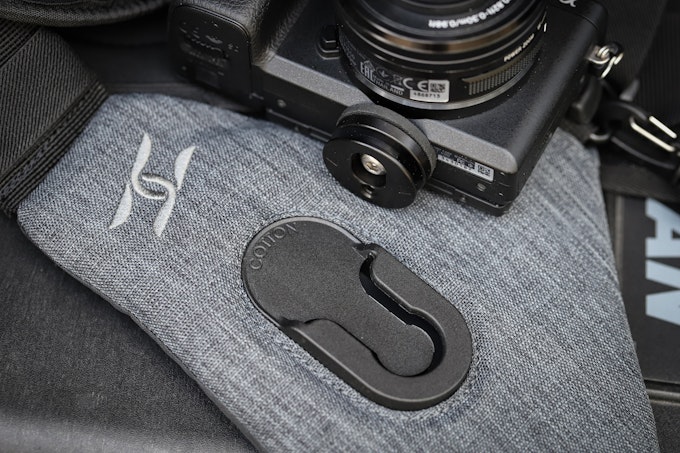 Cotton Carrier's Skout harness is an over the shoulder harness that has adjustable shoulder and waist straps to keep it in place - currently the sole option is a harness that remains over the user's left breast at all times. The camera clips in with mounting hardware that screws into the camera's bottom bolt (which doesn't interfere with the ability to use a tripod, but I'll get to that...) The mounting hardware drops into a hardened plastic clip on the harness, while a 90 degree rotation locks the camera into place on the harness.