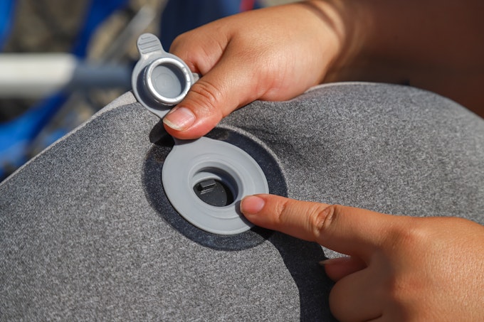 Another noticeable detail is the one-way air valve for inflating and deflating the pillow. Beneath the valve is a soft piece of rubber that lets you inflate and seal the pillow without losing any air. To deflate, you just put your finger on it while you fold the pillow up and stuff it back inside its stuff sack.