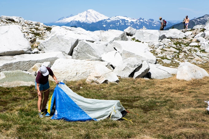 Not only is it teeny tiny and an actual pleasure to carry up a mountain, but it's also super easy to set up. For my first time with no instructions, I'd say it took me 5 minutes tops. It does require staking out but unless you're camping on rocks, the tent comes with some pretty indestructible stakes, and I've never had any problems finding soft ground to pop up in.