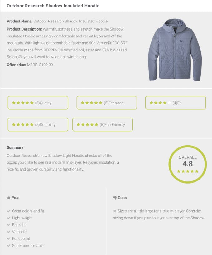 The Shadow gets bonus points for being eco friendly while maintaining its functionality. This is thanks to Outdoor Research’s new VerticalX™ ECO SR insulation. It’s comprised of recycled polyester and bio based sorona. It’s an eco friendly insulation that actually works the way you’d like it to.