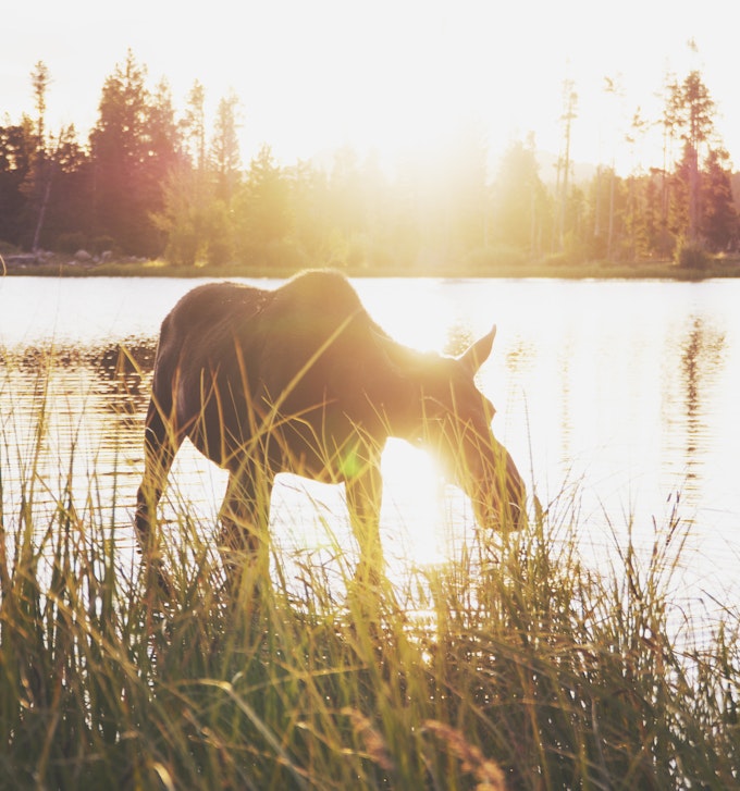 I had been coming to this lake pretty frequently for sunrise in the summer. On this particular morning I arrived a bit too late to catch the alpenglow on the peaks for the photos I wanted to shoot. I knew there was a Moose that usually stayed in that area at sunrise so I decided to wait around to see if she would show up. After a few minutes I heard a noise in the woods behind me. I turned around and saw her grazing, slowly making her way toward the lake where I was standing. After a few minutes she walked right past me, nearly close enough to touch. I stuck around for a little while to take a few photos while the light was good.