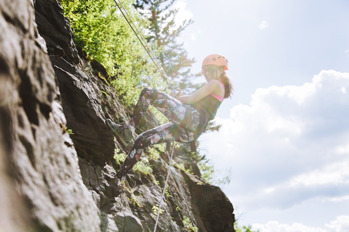 Almost straight off the bus I wind up on the chair lift with a crew of climbers ready to take on the summit. The ride up is thrilling, giving a whole new perspective of a ski mountain without its white blanket. I haven’t rappelled in forever so taking that first leap of faith backwards over the rock face gets my heart racing. After a few steps down I relax, hanging there for a moment to look around. I catch huge smiles on the faces of others feeling the exhilaration of climbing outside for the first time.