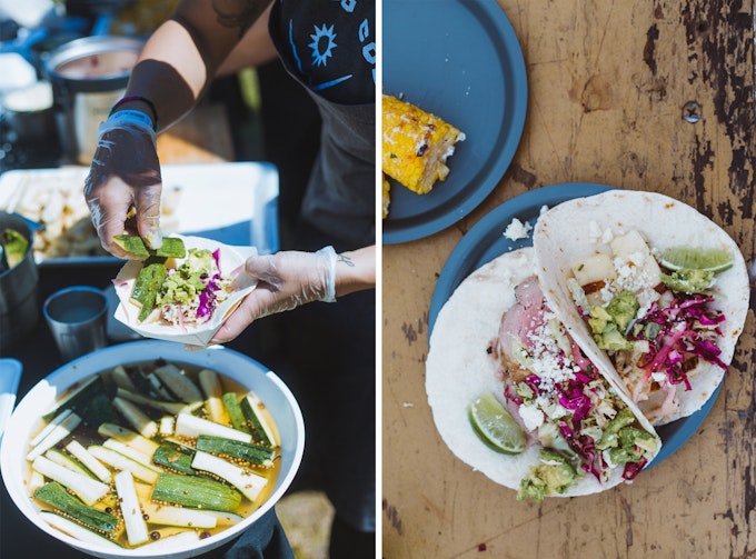 As someone who believes one big hurdle in getting people outside sometimes is the unknown around cooking, I love seeing a new take on the camp taco being whipped up at the Backcountry Camping tent with Stanley, who did some very creative things with camp corn over the grill, halloumi steak, and pickled cucumber.