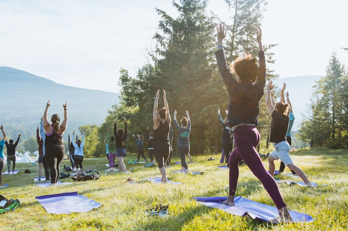 Before the day heats up we’re on the side of the mountain, mats amongst the dewey grass, breathing through a morning yoga session. This beats an indoor studio any day.