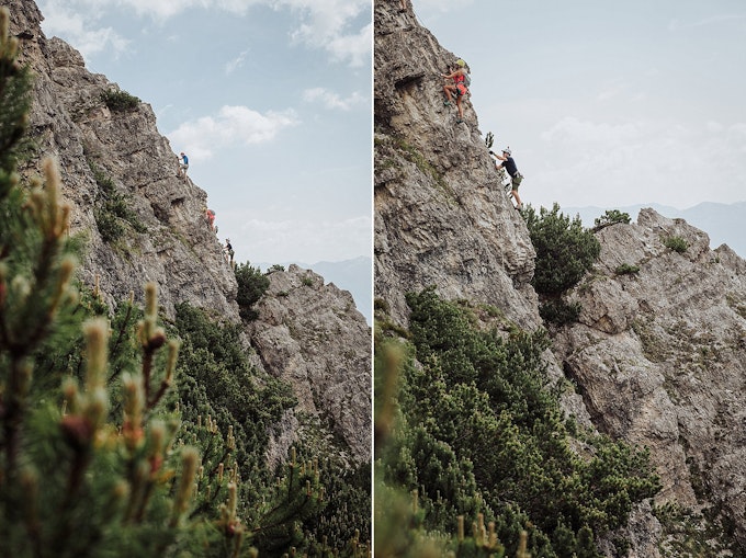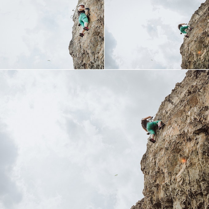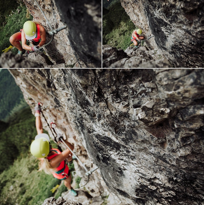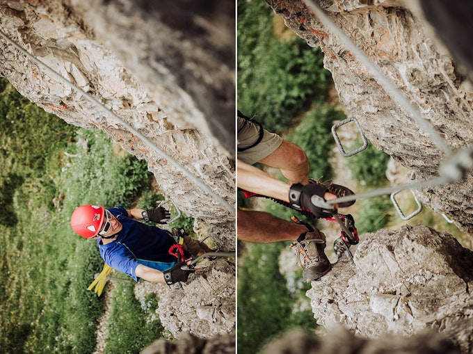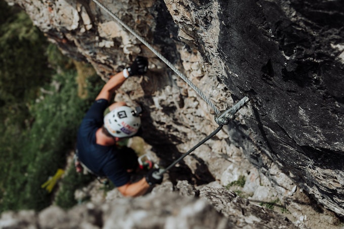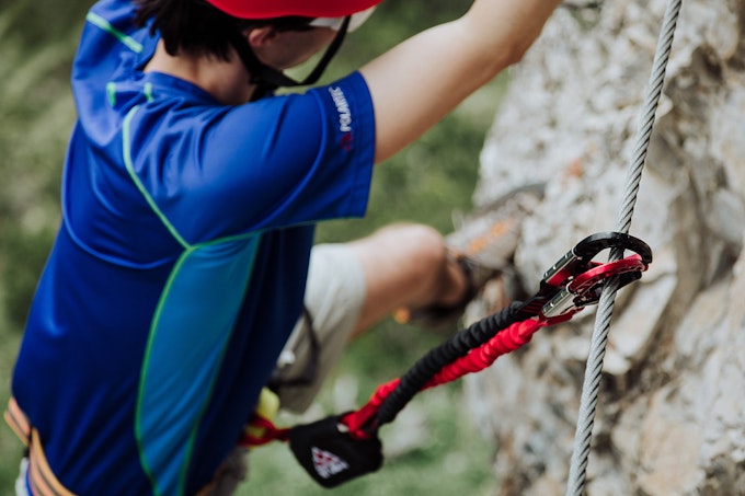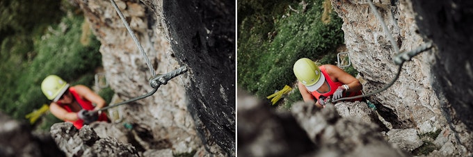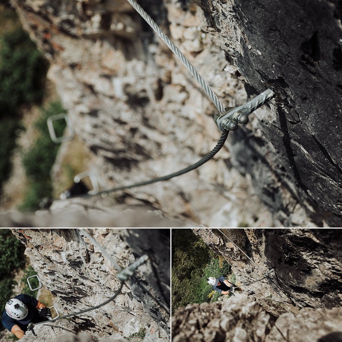 Instead of having ropes like in normal climbing, in via ferrata there's an iron cable already drilled in to the rock face, and the climber wears a special climbing set which is comprised of two flexible cords, each with a special carabiner on the end. As you climb up the cables, you clip yourself on to the iron cable which is fixed to the rock. Since the cable is fixed at many places, you must un-clip and re-clip as you climb. Having the two carabiners means that as you re-clip, you're always attached with at least one cable.