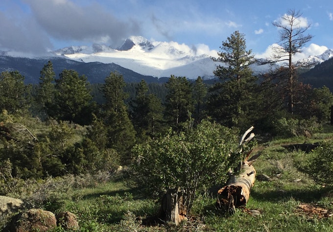 We got to our campsite on Friday night and it was gorgeous. Views of Long's Peak from our tent and the surrounding mountain ranges were visible. We even had the sound of a river running right near our tent. However, that river was the melted three feet of snow from the weekend before and was not supposed to be there. Our campsite was a swamp except for the tent pad which was not too bad. The fire pit was full of a foot or more of water, but we realized we could lift and rotate it and get rid of the water. We decided we were good to go and set up camp. It was really cold but gorgeous, but you could not walk across our site without being in deep mud or the newly formed swampy marsh. So, we made some adjustments. Instead of making dinner in the muck and cold, we hopped in the car and drove into Estes Park for a nice warm meal inside. It was awesome. We saw tons of elk on the way there and when we sat down to dinner, the storm clouds moved in and the temperature dropped lower.