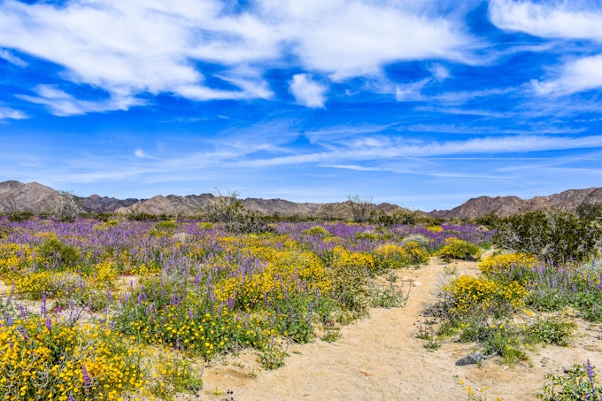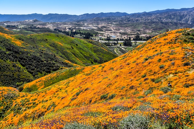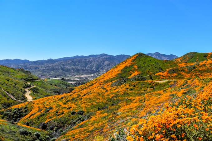 Walker Canyon has bloomed with orange poppies. The colors are amazing, some of the best I saw on my trip. I do need to stress that if you do decide to come, please be respectful. The city shutdown the canyon the Sunday after I came because of too many disrespectful visitors. It has reopened but I wouldn't go on a weekend. I went on a Thursday and parked about 1/2 mile from the trailhead. It is very crowded. I saw many people walking through the fields trampling flowers and laying on top of flowers for pictures - please don't be those people! I spent a few hours here taking photos but I had plans to camp in Joshua Tree, so I needed to move on.
