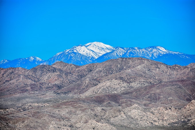 At the time of this trip only the southern part of Joshua Tree was blooming. So for the first part the second day I didn't really see much in terms of wildflowers but it was still fun. I hiked back to my car at sunrise from where I camped then did a quick morning hike up Ryan Mountain which gives great views of the desert below. It was beautiful to see snow on the mountains in the background behind the desert.