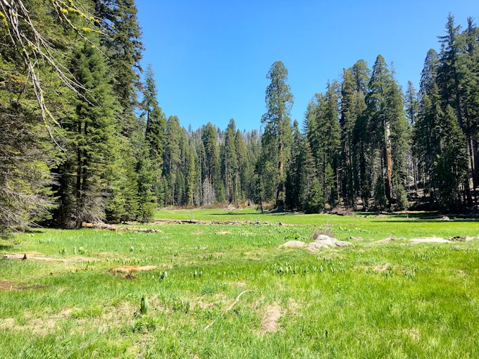 Driving along Cresent Meadow Road, before you reach the beautiful meadow, you will drive thru (or bypass) "Tunnel Log", which is a large Sequoia tree that fell in 1937. A year later, a tunnel was carved through for tourists to drive thru. At the end of the road is where you will find parking for Crescent Meadow. Crescent Meadow is also called "The Gem of the Sierras" and after spending some time hiking around the loop trail, it is no wonder why. This meadow was stunning! I am especially grateful to have been able to visit during the spring because everything around the meadow was so green! You walk along the semi paved trail to the serene sounds of Pacific Treefrogs and the many flowing creeks that form in the spring due to the melting snow from the winter storms. I initially had not planned on visiting the meadow as I was unsure how we would fair on time, but I am certainly glad we did!